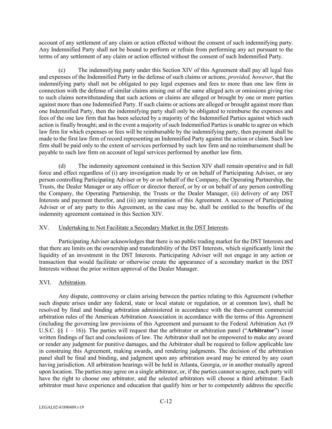 C-12 LEGAL02\41890489.v19 account of any settlement of any claim or action effected without the consent of such indemnifying party. Any Indemnified Party shall not be bound to perform or refrain from performing any act pursuant to the terms of any settlement of any claim or action effected without the consent of such Indemnified Party. (c) The indemnifying party under this Section XIV of this Agreement shall pay all legal fees and expenses of the Indemnified Party in the defense of such claims or actions; provided, however, that the indemnifying party shall not be obligated to pay legal expenses and fees to more than one law firm in connection with the defense of similar claims arising out of the same alleged acts or omissions giving rise to such claims notwithstanding that such actions or claims are alleged or brought by one or more parties against more than one Indemnified Party. If such claims or actions are alleged or brought against more than one Indemnified Party, then the indemnifying party shall only be obligated to reimburse the expenses and fees of the one law firm that has been selected by a majority of the Indemnified Parties against which such action is finally brought; and in the event a majority of such Indemnified Parties is unable to agree on which law firm for which expenses or fees will be reimbursable by the indemnifying party, then payment shall be made to the first law firm of record representing an Indemnified Party against the action or claim. Such law firm shall be paid only to the extent of services performed by such law firm and no reimbursement shall be payable to such law firm on account of legal services performed by another law firm. (d) The indemnity agreement contained in this Section XIV shall remain operative and in full force and effect regardless of (i) any investigation made by or on behalf of Participating Adviser, or any person controlling Participating Adviser or by or on behalf of the Company, the Operating Partnership, the Trusts, the Dealer Manager or any officer or director thereof, or by or on behalf of any person controlling the Company, the Operating Partnership, the Trusts or the Dealer Manager, (ii) delivery of any DST Interests and payment therefor, and (iii) any termination of this Agreement. A successor of Participating Adviser or of any party to this Agreement, as the case may be, shall be entitled to the benefits of the indemnity agreement contained in this Section XIV. XV. Undertaking to Not Facilitate a Secondary Market in the DST Interests. Participating Adviser acknowledges that there is no public trading market for the DST Interests and that there are limits on the ownership and transferability of the DST Interests, which significantly limit the liquidity of an investment in the DST Interests. Participating Adviser will not engage in any action or transaction that would facilitate or otherwise create the appearance of a secondary market in the DST Interests without the prior written approval of the Dealer Manager. XVI. Arbitration. Any dispute, controversy or claim arising between the parties relating to this Agreement (whether such dispute arises under any federal, state or local statute or regulation, or at common law), shall be resolved by final and binding arbitration administered in accordance with the then-current commercial arbitration rules of the American Arbitration Association in accordance with the terms of this Agreement (including the governing law provisions of this Agreement and pursuant to the Federal Arbitration Act (9 U.S.C. §§ 1 – 16)). The parties will request that the arbitrator or arbitration panel (“Arbitrator”) issue written findings of fact and conclusions of law. The Arbitrator shall not be empowered to make any award or render any judgment for punitive damages, and the Arbitrator shall be required to follow applicable law in construing this Agreement, making awards, and rendering judgments. The decision of the arbitration panel shall be final and binding, and judgment upon any arbitration award may be entered by any court having jurisdiction. All arbitration hearings will be held in Atlanta, Georgia, or in another mutually agreed upon location. The parties may agree on a single arbitrator, or, if the parties cannot so agree, each party will have the right to choose one arbitrator, and the selected arbitrators will choose a third arbitrator. Each arbitrator must have experience and education that qualify him or her to competently address the specific