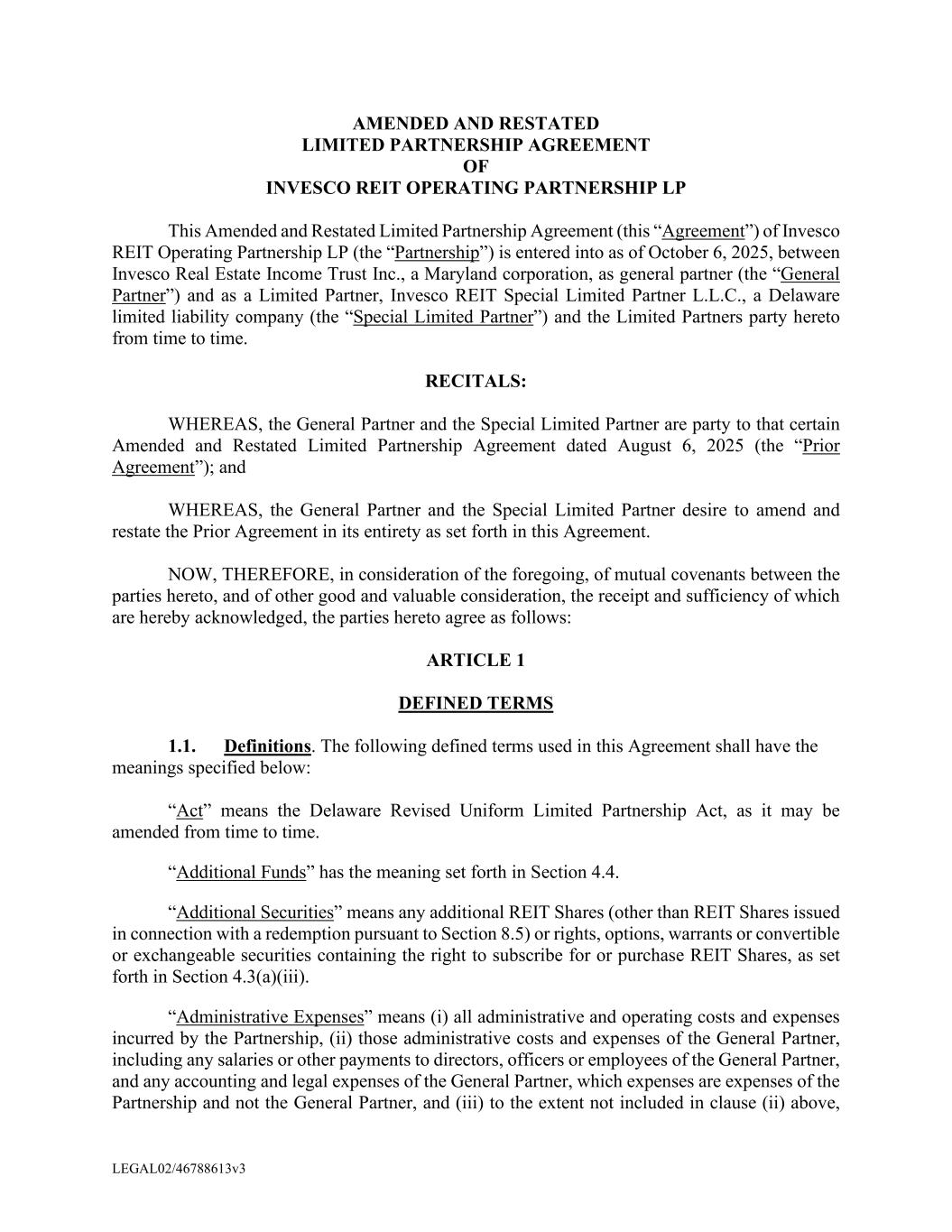 LEGAL02/46788613v3 AMENDED AND RESTATED LIMITED PARTNERSHIP AGREEMENT OF INVESCO REIT OPERATING PARTNERSHIP LP This Amended and Restated Limited Partnership Agreement (this “Agreement”) of Invesco REIT Operating Partnership LP (the “Partnership”) is entered into as of October 6, 2025, between Invesco Real Estate Income Trust Inc., a Maryland corporation, as general partner (the “General Partner”) and as a Limited Partner, Invesco REIT Special Limited Partner L.L.C., a Delaware limited liability company (the “Special Limited Partner”) and the Limited Partners party hereto from time to time. RECITALS: WHEREAS, the General Partner and the Special Limited Partner are party to that certain Amended and Restated Limited Partnership Agreement dated August 6, 2025 (the “Prior Agreement”); and WHEREAS, the General Partner and the Special Limited Partner desire to amend and restate the Prior Agreement in its entirety as set forth in this Agreement. NOW, THEREFORE, in consideration of the foregoing, of mutual covenants between the parties hereto, and of other good and valuable consideration, the receipt and sufficiency of which are hereby acknowledged, the parties hereto agree as follows: ARTICLE 1 DEFINED TERMS 1.1. Definitions. The following defined terms used in this Agreement shall have the meanings specified below: “Act” means the Delaware Revised Uniform Limited Partnership Act, as it may be amended from time to time. “Additional Funds” has the meaning set forth in Section 4.4. “Additional Securities” means any additional REIT Shares (other than REIT Shares issued in connection with a redemption pursuant to Section 8.5) or rights, options, warrants or convertible or exchangeable securities containing the right to subscribe for or purchase REIT Shares, as set forth in Section 4.3(a)(iii). “Administrative Expenses” means (i) all administrative and operating costs and expenses incurred by the Partnership, (ii) those administrative costs and expenses of the General Partner, including any salaries or other payments to directors, officers or employees of the General Partner, and any accounting and legal expenses of the General Partner, which expenses are expenses of the Partnership and not the General Partner, and (iii) to the extent not included in clause (ii) above,