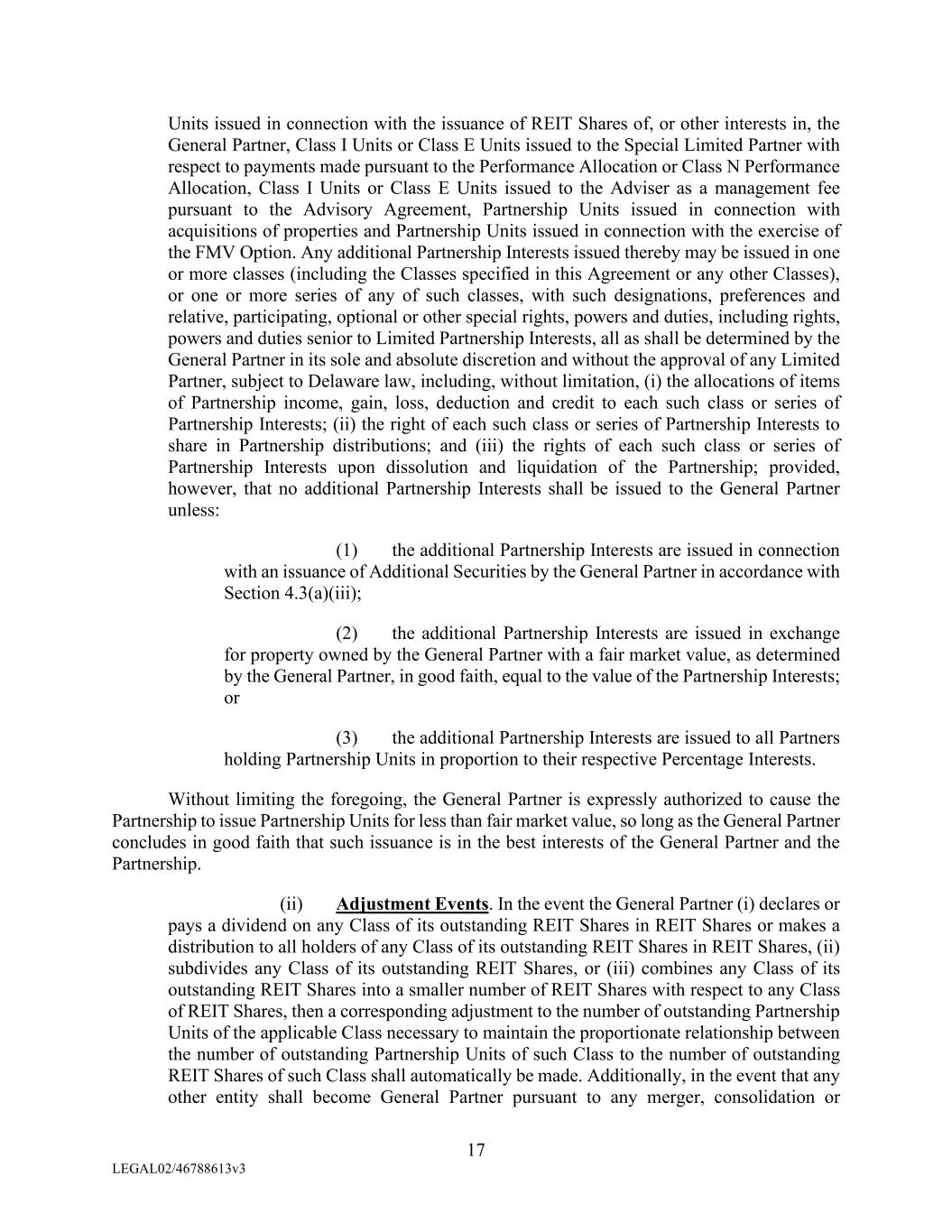17 LEGAL02/46788613v3 Units issued in connection with the issuance of REIT Shares of, or other interests in, the General Partner, Class I Units or Class E Units issued to the Special Limited Partner with respect to payments made pursuant to the Performance Allocation or Class N Performance Allocation, Class I Units or Class E Units issued to the Adviser as a management fee pursuant to the Advisory Agreement, Partnership Units issued in connection with acquisitions of properties and Partnership Units issued in connection with the exercise of the FMV Option. Any additional Partnership Interests issued thereby may be issued in one or more classes (including the Classes specified in this Agreement or any other Classes), or one or more series of any of such classes, with such designations, preferences and relative, participating, optional or other special rights, powers and duties, including rights, powers and duties senior to Limited Partnership Interests, all as shall be determined by the General Partner in its sole and absolute discretion and without the approval of any Limited Partner, subject to Delaware law, including, without limitation, (i) the allocations of items of Partnership income, gain, loss, deduction and credit to each such class or series of Partnership Interests; (ii) the right of each such class or series of Partnership Interests to share in Partnership distributions; and (iii) the rights of each such class or series of Partnership Interests upon dissolution and liquidation of the Partnership; provided, however, that no additional Partnership Interests shall be issued to the General Partner unless: (1) the additional Partnership Interests are issued in connection with an issuance of Additional Securities by the General Partner in accordance with Section 4.3(a)(iii); (2) the additional Partnership Interests are issued in exchange for property owned by the General Partner with a fair market value, as determined by the General Partner, in good faith, equal to the value of the Partnership Interests; or (3) the additional Partnership Interests are issued to all Partners holding Partnership Units in proportion to their respective Percentage Interests. Without limiting the foregoing, the General Partner is expressly authorized to cause the Partnership to issue Partnership Units for less than fair market value, so long as the General Partner concludes in good faith that such issuance is in the best interests of the General Partner and the Partnership. (ii) Adjustment Events. In the event the General Partner (i) declares or pays a dividend on any Class of its outstanding REIT Shares in REIT Shares or makes a distribution to all holders of any Class of its outstanding REIT Shares in REIT Shares, (ii) subdivides any Class of its outstanding REIT Shares, or (iii) combines any Class of its outstanding REIT Shares into a smaller number of REIT Shares with respect to any Class of REIT Shares, then a corresponding adjustment to the number of outstanding Partnership Units of the applicable Class necessary to maintain the proportionate relationship between the number of outstanding Partnership Units of such Class to the number of outstanding REIT Shares of such Class shall automatically be made. Additionally, in the event that any other entity shall become General Partner pursuant to any merger, consolidation or