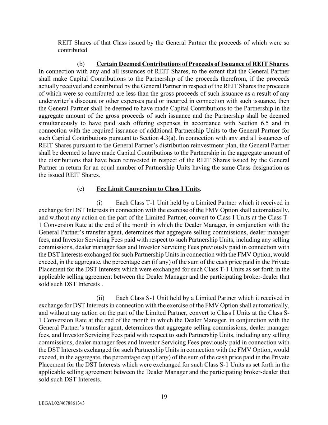 19 LEGAL02/46788613v3 REIT Shares of that Class issued by the General Partner the proceeds of which were so contributed. (b) Certain Deemed Contributions of Proceeds of Issuance of REIT Shares. In connection with any and all issuances of REIT Shares, to the extent that the General Partner shall make Capital Contributions to the Partnership of the proceeds therefrom, if the proceeds actually received and contributed by the General Partner in respect of the REIT Shares the proceeds of which were so contributed are less than the gross proceeds of such issuance as a result of any underwriter’s discount or other expenses paid or incurred in connection with such issuance, then the General Partner shall be deemed to have made Capital Contributions to the Partnership in the aggregate amount of the gross proceeds of such issuance and the Partnership shall be deemed simultaneously to have paid such offering expenses in accordance with Section 6.5 and in connection with the required issuance of additional Partnership Units to the General Partner for such Capital Contributions pursuant to Section 4.3(a). In connection with any and all issuances of REIT Shares pursuant to the General Partner’s distribution reinvestment plan, the General Partner shall be deemed to have made Capital Contributions to the Partnership in the aggregate amount of the distributions that have been reinvested in respect of the REIT Shares issued by the General Partner in return for an equal number of Partnership Units having the same Class designation as the issued REIT Shares. (c) Fee Limit Conversion to Class I Units. (i) Each Class T-1 Unit held by a Limited Partner which it received in exchange for DST Interests in connection with the exercise of the FMV Option shall automatically, and without any action on the part of the Limited Partner, convert to Class I Units at the Class T- 1 Conversion Rate at the end of the month in which the Dealer Manager, in conjunction with the General Partner’s transfer agent, determines that aggregate selling commissions, dealer manager fees, and Investor Servicing Fees paid with respect to such Partnership Units, including any selling commissions, dealer manager fees and Investor Servicing Fees previously paid in connection with the DST Interests exchanged for such Partnership Units in connection with the FMV Option, would exceed, in the aggregate, the percentage cap (if any) of the sum of the cash price paid in the Private Placement for the DST Interests which were exchanged for such Class T-1 Units as set forth in the applicable selling agreement between the Dealer Manager and the participating broker-dealer that sold such DST Interests . (ii) Each Class S-1 Unit held by a Limited Partner which it received in exchange for DST Interests in connection with the exercise of the FMV Option shall automatically, and without any action on the part of the Limited Partner, convert to Class I Units at the Class S- 1 Conversion Rate at the end of the month in which the Dealer Manager, in conjunction with the General Partner’s transfer agent, determines that aggregate selling commissions, dealer manager fees, and Investor Servicing Fees paid with respect to such Partnership Units, including any selling commissions, dealer manager fees and Investor Servicing Fees previously paid in connection with the DST Interests exchanged for such Partnership Units in connection with the FMV Option, would exceed, in the aggregate, the percentage cap (if any) of the sum of the cash price paid in the Private Placement for the DST Interests which were exchanged for such Class S-1 Units as set forth in the applicable selling agreement between the Dealer Manager and the participating broker-dealer that sold such DST Interests.