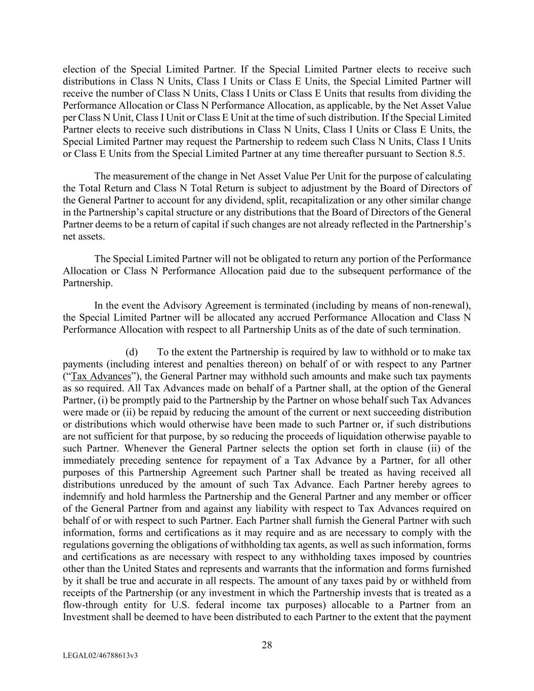 28 LEGAL02/46788613v3 election of the Special Limited Partner. If the Special Limited Partner elects to receive such distributions in Class N Units, Class I Units or Class E Units, the Special Limited Partner will receive the number of Class N Units, Class I Units or Class E Units that results from dividing the Performance Allocation or Class N Performance Allocation, as applicable, by the Net Asset Value per Class N Unit, Class I Unit or Class E Unit at the time of such distribution. If the Special Limited Partner elects to receive such distributions in Class N Units, Class I Units or Class E Units, the Special Limited Partner may request the Partnership to redeem such Class N Units, Class I Units or Class E Units from the Special Limited Partner at any time thereafter pursuant to Section 8.5. The measurement of the change in Net Asset Value Per Unit for the purpose of calculating the Total Return and Class N Total Return is subject to adjustment by the Board of Directors of the General Partner to account for any dividend, split, recapitalization or any other similar change in the Partnership’s capital structure or any distributions that the Board of Directors of the General Partner deems to be a return of capital if such changes are not already reflected in the Partnership’s net assets. The Special Limited Partner will not be obligated to return any portion of the Performance Allocation or Class N Performance Allocation paid due to the subsequent performance of the Partnership. In the event the Advisory Agreement is terminated (including by means of non-renewal), the Special Limited Partner will be allocated any accrued Performance Allocation and Class N Performance Allocation with respect to all Partnership Units as of the date of such termination. (d) To the extent the Partnership is required by law to withhold or to make tax payments (including interest and penalties thereon) on behalf of or with respect to any Partner (“Tax Advances”), the General Partner may withhold such amounts and make such tax payments as so required. All Tax Advances made on behalf of a Partner shall, at the option of the General Partner, (i) be promptly paid to the Partnership by the Partner on whose behalf such Tax Advances were made or (ii) be repaid by reducing the amount of the current or next succeeding distribution or distributions which would otherwise have been made to such Partner or, if such distributions are not sufficient for that purpose, by so reducing the proceeds of liquidation otherwise payable to such Partner. Whenever the General Partner selects the option set forth in clause (ii) of the immediately preceding sentence for repayment of a Tax Advance by a Partner, for all other purposes of this Partnership Agreement such Partner shall be treated as having received all distributions unreduced by the amount of such Tax Advance. Each Partner hereby agrees to indemnify and hold harmless the Partnership and the General Partner and any member or officer of the General Partner from and against any liability with respect to Tax Advances required on behalf of or with respect to such Partner. Each Partner shall furnish the General Partner with such information, forms and certifications as it may require and as are necessary to comply with the regulations governing the obligations of withholding tax agents, as well as such information, forms and certifications as are necessary with respect to any withholding taxes imposed by countries other than the United States and represents and warrants that the information and forms furnished by it shall be true and accurate in all respects. The amount of any taxes paid by or withheld from receipts of the Partnership (or any investment in which the Partnership invests that is treated as a flow-through entity for U.S. federal income tax purposes) allocable to a Partner from an Investment shall be deemed to have been distributed to each Partner to the extent that the payment