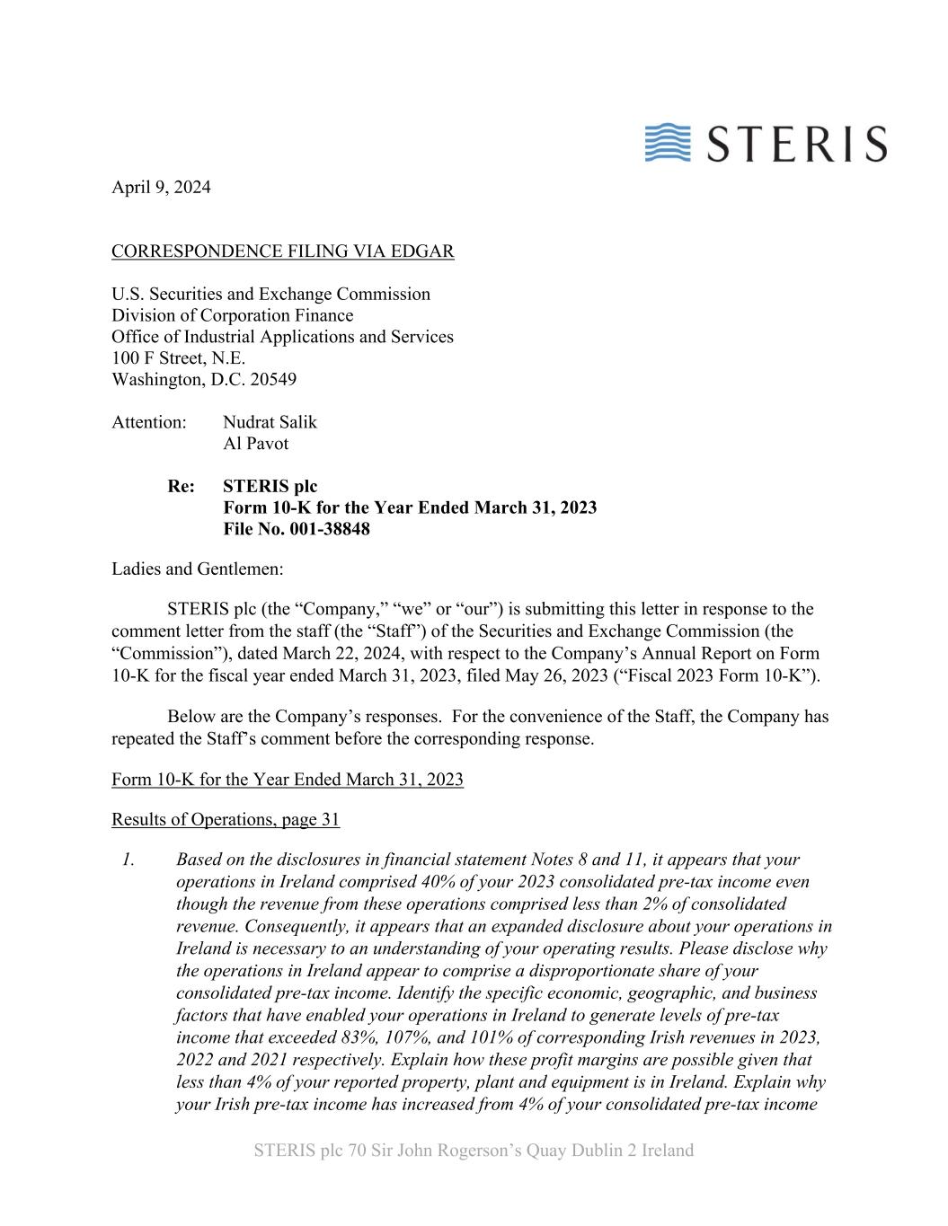 STERIS plc 70 Sir John Rogerson’s Quay Dublin 2 Ireland April 9, 2024 CORRESPONDENCE FILING VIA EDGAR U.S. Securities and Exchange Commission Division of Corporation Finance Office of Industrial Applications and Services 100 F Street, N.E. Washington, D.C. 20549 Attention: Nudrat Salik Al Pavot Re: STERIS plc Form 10-K for the Year Ended March 31, 2023 File No. 001-38848 Ladies and Gentlemen: STERIS plc (the “Company,” “we” or “our”) is submitting this letter in response to the comment letter from the staff (the “Staff”) of the Securities and Exchange Commission (the “Commission”), dated March 22, 2024, with respect to the Company’s Annual Report on Form 10-K for the fiscal year ended March 31, 2023, filed May 26, 2023 (“Fiscal 2023 Form 10-K”). Below are the Company’s responses. For the convenience of the Staff, the Company has repeated the Staff’s comment before the corresponding response. Form 10-K for the Year Ended March 31, 2023 Results of Operations, page 31 1. Based on the disclosures in financial statement Notes 8 and 11, it appears that your operations in Ireland comprised 40% of your 2023 consolidated pre-tax income even though the revenue from these operations comprised less than 2% of consolidated revenue. Consequently, it appears that an expanded disclosure about your operations in Ireland is necessary to an understanding of your operating results. Please disclose why the operations in Ireland appear to comprise a disproportionate share of your consolidated pre-tax income. Identify the specific economic, geographic, and business factors that have enabled your operations in Ireland to generate levels of pre-tax income that exceeded 83%, 107%, and 101% of corresponding Irish revenues in 2023, 2022 and 2021 respectively. Explain how these profit margins are possible given that less than 4% of your reported property, plant and equipment is in Ireland. Explain why your Irish pre-tax income has increased from 4% of your consolidated pre-tax income