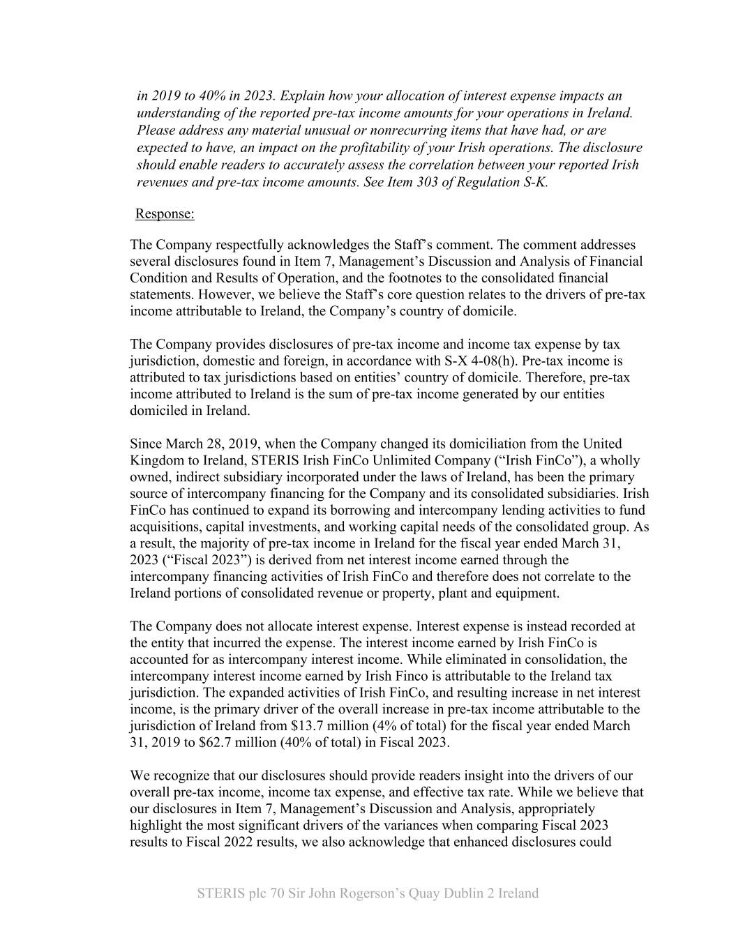 STERIS plc 70 Sir John Rogerson’s Quay Dublin 2 Ireland in 2019 to 40% in 2023. Explain how your allocation of interest expense impacts an understanding of the reported pre-tax income amounts for your operations in Ireland. Please address any material unusual or nonrecurring items that have had, or are expected to have, an impact on the profitability of your Irish operations. The disclosure should enable readers to accurately assess the correlation between your reported Irish revenues and pre-tax income amounts. See Item 303 of Regulation S-K. Response: The Company respectfully acknowledges the Staff’s comment. The comment addresses several disclosures found in Item 7, Management’s Discussion and Analysis of Financial Condition and Results of Operation, and the footnotes to the consolidated financial statements. However, we believe the Staff’s core question relates to the drivers of pre-tax income attributable to Ireland, the Company’s country of domicile. The Company provides disclosures of pre-tax income and income tax expense by tax jurisdiction, domestic and foreign, in accordance with S-X 4-08(h). Pre-tax income is attributed to tax jurisdictions based on entities’ country of domicile. Therefore, pre-tax income attributed to Ireland is the sum of pre-tax income generated by our entities domiciled in Ireland. Since March 28, 2019, when the Company changed its domiciliation from the United Kingdom to Ireland, STERIS Irish FinCo Unlimited Company (“Irish FinCo”), a wholly owned, indirect subsidiary incorporated under the laws of Ireland, has been the primary source of intercompany financing for the Company and its consolidated subsidiaries. Irish FinCo has continued to expand its borrowing and intercompany lending activities to fund acquisitions, capital investments, and working capital needs of the consolidated group. As a result, the majority of pre-tax income in Ireland for the fiscal year ended March 31, 2023 (“Fiscal 2023”) is derived from net interest income earned through the intercompany financing activities of Irish FinCo and therefore does not correlate to the Ireland portions of consolidated revenue or property, plant and equipment. The Company does not allocate interest expense. Interest expense is instead recorded at the entity that incurred the expense. The interest income earned by Irish FinCo is accounted for as intercompany interest income. While eliminated in consolidation, the intercompany interest income earned by Irish Finco is attributable to the Ireland tax jurisdiction. The expanded activities of Irish FinCo, and resulting increase in net interest income, is the primary driver of the overall increase in pre-tax income attributable to the jurisdiction of Ireland from $13.7 million (4% of total) for the fiscal year ended March 31, 2019 to $62.7 million (40% of total) in Fiscal 2023. We recognize that our disclosures should provide readers insight into the drivers of our overall pre-tax income, income tax expense, and effective tax rate. While we believe that our disclosures in Item 7, Management’s Discussion and Analysis, appropriately highlight the most significant drivers of the variances when comparing Fiscal 2023 results to Fiscal 2022 results, we also acknowledge that enhanced disclosures could