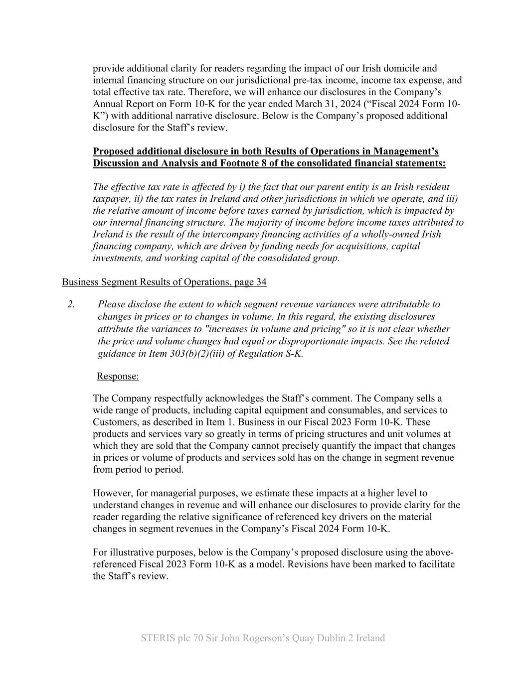 STERIS plc 70 Sir John Rogerson’s Quay Dublin 2 Ireland provide additional clarity for readers regarding the impact of our Irish domicile and internal financing structure on our jurisdictional pre-tax income, income tax expense, and total effective tax rate. Therefore, we will enhance our disclosures in the Company’s Annual Report on Form 10-K for the year ended March 31, 2024 (“Fiscal 2024 Form 10- K”) with additional narrative disclosure. Below is the Company’s proposed additional disclosure for the Staff’s review. Proposed additional disclosure in both Results of Operations in Management’s Discussion and Analysis and Footnote 8 of the consolidated financial statements: The effective tax rate is affected by i) the fact that our parent entity is an Irish resident taxpayer, ii) the tax rates in Ireland and other jurisdictions in which we operate, and iii) the relative amount of income before taxes earned by jurisdiction, which is impacted by our internal financing structure. The majority of income before income taxes attributed to Ireland is the result of the intercompany financing activities of a wholly-owned Irish financing company, which are driven by funding needs for acquisitions, capital investments, and working capital of the consolidated group. Business Segment Results of Operations, page 34 2. Please disclose the extent to which segment revenue variances were attributable to changes in prices or to changes in volume. In this regard, the existing disclosures attribute the variances to "increases in volume and pricing" so it is not clear whether the price and volume changes had equal or disproportionate impacts. See the related guidance in Item 303(b)(2)(iii) of Regulation S-K. Response: The Company respectfully acknowledges the Staff’s comment. The Company sells a wide range of products, including capital equipment and consumables, and services to Customers, as described in Item 1. Business in our Fiscal 2023 Form 10-K. These products and services vary so greatly in terms of pricing structures and unit volumes at which they are sold that the Company cannot precisely quantify the impact that changes in prices or volume of products and services sold has on the change in segment revenue from period to period. However, for managerial purposes, we estimate these impacts at a higher level to understand changes in revenue and will enhance our disclosures to provide clarity for the reader regarding the relative significance of referenced key drivers on the material changes in segment revenues in the Company’s Fiscal 2024 Form 10-K. For illustrative purposes, below is the Company’s proposed disclosure using the above- referenced Fiscal 2023 Form 10-K as a model. Revisions have been marked to facilitate the Staff’s review.
