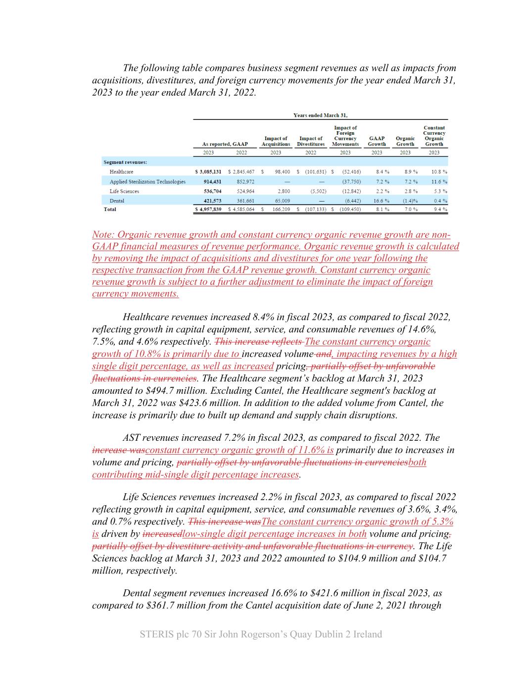STERIS plc 70 Sir John Rogerson’s Quay Dublin 2 Ireland The following table compares business segment revenues as well as impacts from acquisitions, divestitures, and foreign currency movements for the year ended March 31, 2023 to the year ended March 31, 2022. Note: Organic revenue growth and constant currency organic revenue growth are non- GAAP financial measures of revenue performance. Organic revenue growth is calculated by removing the impact of acquisitions and divestitures for one year following the respective transaction from the GAAP revenue growth. Constant currency organic revenue growth is subject to a further adjustment to eliminate the impact of foreign currency movements. Healthcare revenues increased 8.4% in fiscal 2023, as compared to fiscal 2022, reflecting growth in capital equipment, service, and consumable revenues of 14.6%, 7.5%, and 4.6% respectively. This increase reflects The constant currency organic growth of 10.8% is primarily due to increased volume and, impacting revenues by a high single digit percentage, as well as increased pricing, partially offset by unfavorable fluctuations in currencies. The Healthcare segment’s backlog at March 31, 2023 amounted to $494.7 million. Excluding Cantel, the Healthcare segment's backlog at March 31, 2022 was $423.6 million. In addition to the added volume from Cantel, the increase is primarily due to built up demand and supply chain disruptions. AST revenues increased 7.2% in fiscal 2023, as compared to fiscal 2022. The increase wasconstant currency organic growth of 11.6% is primarily due to increases in volume and pricing, partially offset by unfavorable fluctuations in currenciesboth contributing mid-single digit percentage increases. Life Sciences revenues increased 2.2% in fiscal 2023, as compared to fiscal 2022 reflecting growth in capital equipment, service, and consumable revenues of 3.6%, 3.4%, and 0.7% respectively. This increase wasThe constant currency organic growth of 5.3% is driven by increasedlow-single digit percentage increases in both volume and pricing, partially offset by divestiture activity and unfavorable fluctuations in currency. The Life Sciences backlog at March 31, 2023 and 2022 amounted to $104.9 million and $104.7 million, respectively. Dental segment revenues increased 16.6% to $421.6 million in fiscal 2023, as compared to $361.7 million from the Cantel acquisition date of June 2, 2021 through
