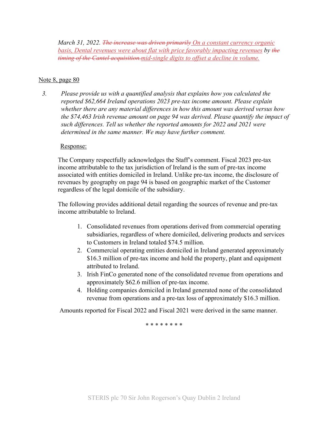 STERIS plc 70 Sir John Rogerson’s Quay Dublin 2 Ireland March 31, 2022. The increase was driven primarily On a constant currency organic basis, Dental revenues were about flat with price favorably impacting revenues by the timing of the Cantel acquisition.mid-single digits to offset a decline in volume. Note 8, page 80 3. Please provide us with a quantified analysis that explains how you calculated the reported $62,664 Ireland operations 2023 pre-tax income amount. Please explain whether there are any material differences in how this amount was derived versus how the $74,463 Irish revenue amount on page 94 was derived. Please quantify the impact of such differences. Tell us whether the reported amounts for 2022 and 2021 were determined in the same manner. We may have further comment. Response: The Company respectfully acknowledges the Staff’s comment. Fiscal 2023 pre-tax income attributable to the tax jurisdiction of Ireland is the sum of pre-tax income associated with entities domiciled in Ireland. Unlike pre-tax income, the disclosure of revenues by geography on page 94 is based on geographic market of the Customer regardless of the legal domicile of the subsidiary. The following provides additional detail regarding the sources of revenue and pre-tax income attributable to Ireland. 1. Consolidated revenues from operations derived from commercial operating subsidiaries, regardless of where domiciled, delivering products and services to Customers in Ireland totaled $74.5 million. 2. Commercial operating entities domiciled in Ireland generated approximately $16.3 million of pre-tax income and hold the property, plant and equipment attributed to Ireland. 3. Irish FinCo generated none of the consolidated revenue from operations and approximately $62.6 million of pre-tax income. 4. Holding companies domiciled in Ireland generated none of the consolidated revenue from operations and a pre-tax loss of approximately $16.3 million. Amounts reported for Fiscal 2022 and Fiscal 2021 were derived in the same manner. * * * * * * * *