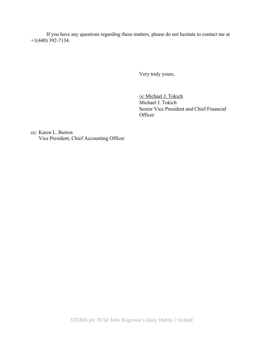 STERIS plc 70 Sir John Rogerson’s Quay Dublin 2 Ireland If you have any questions regarding these matters, please do not hesitate to contact me at +1(440) 392-7134. Very truly yours, /s/ Michael J. Tokich Michael J. Tokich Senior Vice President and Chief Financial Officer cc: Karen L. Burton Vice President, Chief Accounting Officer