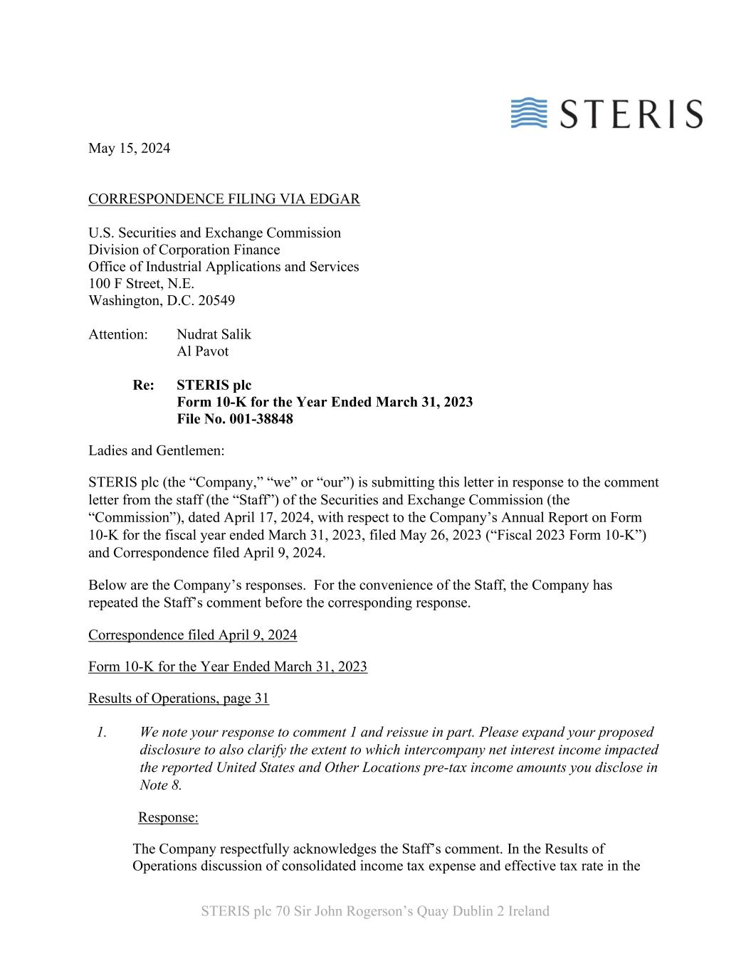 STERIS plc 70 Sir John Rogerson’s Quay Dublin 2 Ireland May 15, 2024 CORRESPONDENCE FILING VIA EDGAR U.S. Securities and Exchange Commission Division of Corporation Finance Office of Industrial Applications and Services 100 F Street, N.E. Washington, D.C. 20549 Attention: Nudrat Salik Al Pavot Re: STERIS plc Form 10-K for the Year Ended March 31, 2023 File No. 001-38848 Ladies and Gentlemen: STERIS plc (the “Company,” “we” or “our”) is submitting this letter in response to the comment letter from the staff (the “Staff”) of the Securities and Exchange Commission (the “Commission”), dated April 17, 2024, with respect to the Company’s Annual Report on Form 10-K for the fiscal year ended March 31, 2023, filed May 26, 2023 (“Fiscal 2023 Form 10-K”) and Correspondence filed April 9, 2024. Below are the Company’s responses. For the convenience of the Staff, the Company has repeated the Staff’s comment before the corresponding response. Correspondence filed April 9, 2024 Form 10-K for the Year Ended March 31, 2023 Results of Operations, page 31 1. We note your response to comment 1 and reissue in part. Please expand your proposed disclosure to also clarify the extent to which intercompany net interest income impacted the reported United States and Other Locations pre-tax income amounts you disclose in Note 8. Response: The Company respectfully acknowledges the Staff’s comment. In the Results of Operations discussion of consolidated income tax expense and effective tax rate in the