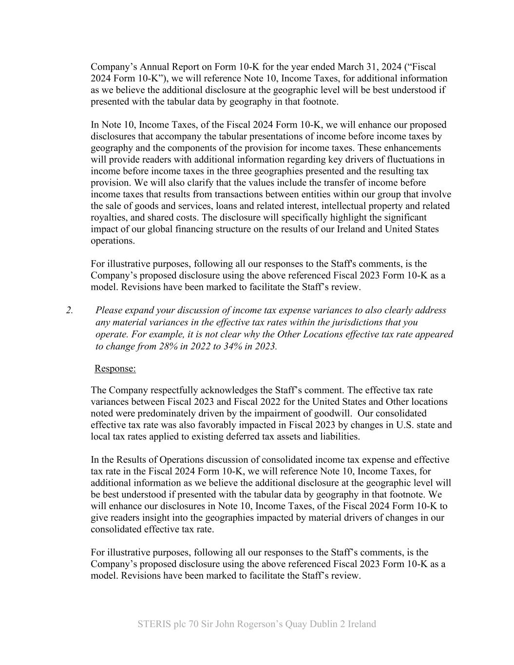 STERIS plc 70 Sir John Rogerson’s Quay Dublin 2 Ireland Company’s Annual Report on Form 10-K for the year ended March 31, 2024 (“Fiscal 2024 Form 10-K”), we will reference Note 10, Income Taxes, for additional information as we believe the additional disclosure at the geographic level will be best understood if presented with the tabular data by geography in that footnote. In Note 10, Income Taxes, of the Fiscal 2024 Form 10-K, we will enhance our proposed disclosures that accompany the tabular presentations of income before income taxes by geography and the components of the provision for income taxes. These enhancements will provide readers with additional information regarding key drivers of fluctuations in income before income taxes in the three geographies presented and the resulting tax provision. We will also clarify that the values include the transfer of income before income taxes that results from transactions between entities within our group that involve the sale of goods and services, loans and related interest, intellectual property and related royalties, and shared costs. The disclosure will specifically highlight the significant impact of our global financing structure on the results of our Ireland and United States operations. For illustrative purposes, following all our responses to the Staff's comments, is the Company’s proposed disclosure using the above referenced Fiscal 2023 Form 10-K as a model. Revisions have been marked to facilitate the Staff’s review. 2. Please expand your discussion of income tax expense variances to also clearly address any material variances in the effective tax rates within the jurisdictions that you operate. For example, it is not clear why the Other Locations effective tax rate appeared to change from 28% in 2022 to 34% in 2023. Response: The Company respectfully acknowledges the Staff’s comment. The effective tax rate variances between Fiscal 2023 and Fiscal 2022 for the United States and Other locations noted were predominately driven by the impairment of goodwill. Our consolidated effective tax rate was also favorably impacted in Fiscal 2023 by changes in U.S. state and local tax rates applied to existing deferred tax assets and liabilities. In the Results of Operations discussion of consolidated income tax expense and effective tax rate in the Fiscal 2024 Form 10-K, we will reference Note 10, Income Taxes, for additional information as we believe the additional disclosure at the geographic level will be best understood if presented with the tabular data by geography in that footnote. We will enhance our disclosures in Note 10, Income Taxes, of the Fiscal 2024 Form 10-K to give readers insight into the geographies impacted by material drivers of changes in our consolidated effective tax rate. For illustrative purposes, following all our responses to the Staff’s comments, is the Company’s proposed disclosure using the above referenced Fiscal 2023 Form 10-K as a model. Revisions have been marked to facilitate the Staff’s review.