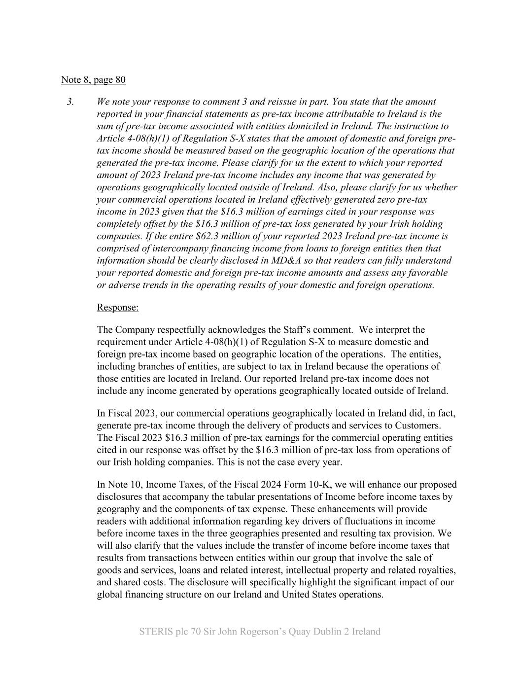 STERIS plc 70 Sir John Rogerson’s Quay Dublin 2 Ireland Note 8, page 80 3. We note your response to comment 3 and reissue in part. You state that the amount reported in your financial statements as pre-tax income attributable to Ireland is the sum of pre-tax income associated with entities domiciled in Ireland. The instruction to Article 4-08(h)(1) of Regulation S-X states that the amount of domestic and foreign pre- tax income should be measured based on the geographic location of the operations that generated the pre-tax income. Please clarify for us the extent to which your reported amount of 2023 Ireland pre-tax income includes any income that was generated by operations geographically located outside of Ireland. Also, please clarify for us whether your commercial operations located in Ireland effectively generated zero pre-tax income in 2023 given that the $16.3 million of earnings cited in your response was completely offset by the $16.3 million of pre-tax loss generated by your Irish holding companies. If the entire $62.3 million of your reported 2023 Ireland pre-tax income is comprised of intercompany financing income from loans to foreign entities then that information should be clearly disclosed in MD&A so that readers can fully understand your reported domestic and foreign pre-tax income amounts and assess any favorable or adverse trends in the operating results of your domestic and foreign operations. Response: The Company respectfully acknowledges the Staff’s comment. We interpret the requirement under Article 4-08(h)(1) of Regulation S-X to measure domestic and foreign pre-tax income based on geographic location of the operations. The entities, including branches of entities, are subject to tax in Ireland because the operations of those entities are located in Ireland. Our reported Ireland pre-tax income does not include any income generated by operations geographically located outside of Ireland. In Fiscal 2023, our commercial operations geographically located in Ireland did, in fact, generate pre-tax income through the delivery of products and services to Customers. The Fiscal 2023 $16.3 million of pre-tax earnings for the commercial operating entities cited in our response was offset by the $16.3 million of pre-tax loss from operations of our Irish holding companies. This is not the case every year. In Note 10, Income Taxes, of the Fiscal 2024 Form 10-K, we will enhance our proposed disclosures that accompany the tabular presentations of Income before income taxes by geography and the components of tax expense. These enhancements will provide readers with additional information regarding key drivers of fluctuations in income before income taxes in the three geographies presented and resulting tax provision. We will also clarify that the values include the transfer of income before income taxes that results from transactions between entities within our group that involve the sale of goods and services, loans and related interest, intellectual property and related royalties, and shared costs. The disclosure will specifically highlight the significant impact of our global financing structure on our Ireland and United States operations.