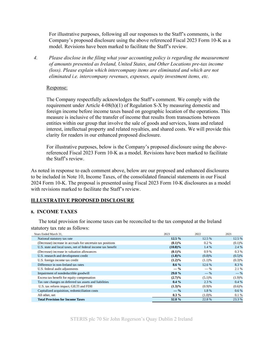 STERIS plc 70 Sir John Rogerson’s Quay Dublin 2 Ireland For illustrative purposes, following all our responses to the Staff’s comments, is the Company’s proposed disclosure using the above referenced Fiscal 2023 Form 10-K as a model. Revisions have been marked to facilitate the Staff’s review. 4. Please disclose in the filing what your accounting policy is regarding the measurement of amounts presented as Ireland, United States, and Other Locations pre-tax income (loss). Please explain which intercompany items are eliminated and which are not eliminated i.e. intercompany revenues, expenses, equity investment items, etc. Response: The Company respectfully acknowledges the Staff’s comment. We comply with the requirement under Article 4-08(h)(1) of Regulation S-X by measuring domestic and foreign income before income taxes based on geographic location of the operations. This measure is inclusive of the transfer of income that results from transactions between entities within our group that involve the sale of goods and services, loans and related interest, intellectual property and related royalties, and shared costs. We will provide this clarity for readers in our enhanced proposed disclosure. For illustrative purposes, below is the Company’s proposed disclosure using the above- referenced Fiscal 2023 Form 10-K as a model. Revisions have been marked to facilitate the Staff’s review. As noted in response to each comment above, below are our proposed and enhanced disclosures to be included in Note 10, Income Taxes, of the consolidated financial statements in our Fiscal 2024 Form 10-K. The proposal is presented using Fiscal 2023 Form 10-K disclosures as a model with revisions marked to facilitate the Staff’s review. ILLUSTRATIVE PROPOSED DISCLOSURE 8. INCOME TAXES The total provision for income taxes can be reconciled to the tax computed at the Ireland statutory tax rate as follows: