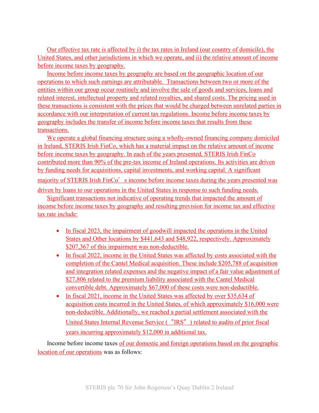 STERIS plc 70 Sir John Rogerson’s Quay Dublin 2 Ireland Our effective tax rate is affected by i) the tax rates in Ireland (our country of domicile), the United States, and other jurisdictions in which we operate, and ii) the relative amount of income before income taxes by geography. Income before income taxes by geography are based on the geographic location of our operations to which such earnings are attributable. Transactions between two or more of the entities within our group occur routinely and involve the sale of goods and services, loans and related interest, intellectual property and related royalties, and shared costs. The pricing used in these transactions is consistent with the prices that would be charged between unrelated parties in accordance with our interpretation of current tax regulations. Income before income taxes by geography includes the transfer of income before income taxes that results from these transactions. We operate a global financing structure using a wholly-owned financing company domiciled in Ireland, STERIS Irish FinCo, which has a material impact on the relative amount of income before income taxes by geography. In each of the years presented, STERIS Irish FinCo contributed more than 90% of the pre-tax income of Ireland operations. Its activities are driven by funding needs for acquisitions, capital investments, and working capital. A significant majority of STERIS Irish FinCo’s income before income taxes during the years presented was driven by loans to our operations in the United States in response to such funding needs. Significant transactions not indicative of operating trends that impacted the amount of income before income taxes by geography and resulting provision for income tax and effective tax rate include: • In fiscal 2023, the impairment of goodwill impacted the operations in the United States and Other locations by $441,643 and $48,922, respectively. Approximately $207,367 of this impairment was non-deductible. • In fiscal 2022, income in the United States was affected by costs associated with the completion of the Cantel Medical acquisition. These include $205,788 of acquisition and integration related expenses and the negative impact of a fair value adjustment of $27,806 related to the premium liability associated with the Cantel Medical convertible debt. Approximately $67,000 of these costs were non-deductible. • In fiscal 2021, income in the United States was affected by over $35,634 of acquisition costs incurred in the United States, of which approximately $16,000 were non-deductible. Additionally, we reached a partial settlement associated with the United States Internal Revenue Service (“IRS”) related to audits of prior fiscal years incurring approximately $12,000 in additional tax. Income before income taxes of our domestic and foreign operations based on the geographic location of our operations was as follows: