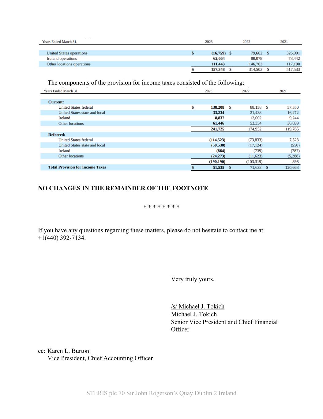 STERIS plc 70 Sir John Rogerson’s Quay Dublin 2 Ireland The components of the provision for income taxes consisted of the following: NO CHANGES IN THE REMAINDER OF THE FOOTNOTE * * * * * * * * If you have any questions regarding these matters, please do not hesitate to contact me at +1(440) 392-7134. Very truly yours, /s/ Michael J. Tokich Michael J. Tokich Senior Vice President and Chief Financial Officer cc: Karen L. Burton Vice President, Chief Accounting Officer