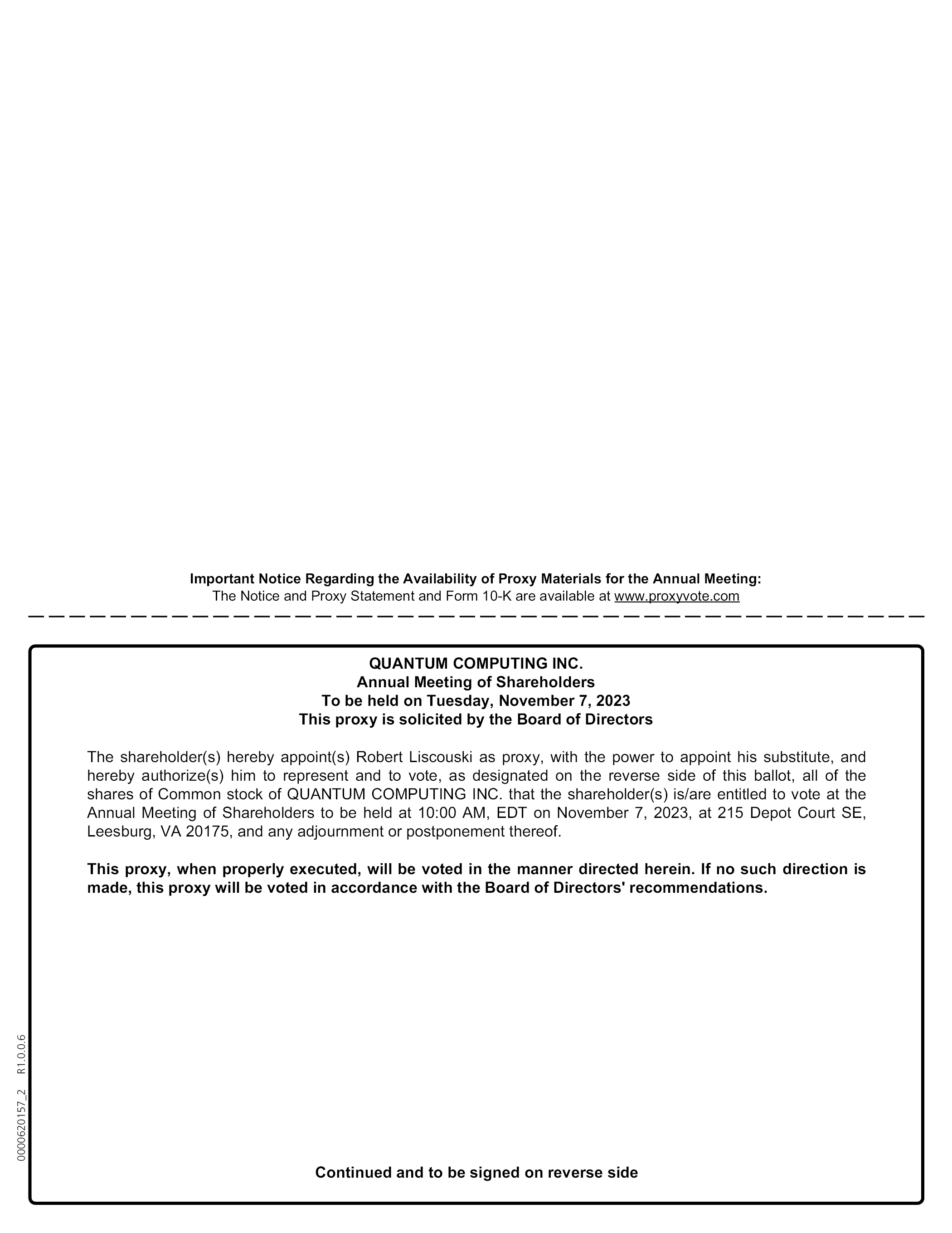 Important Notice Regarding the Availability of Proxy Materials for the Annual Meeting: The Notice and Proxy Statement and Form 10-K are available at www.proxyvote.com QUANTUM COMPUTING INC. Annual Meeting of Shareholders To be held on Tuesday, November 7, 2023 This proxy is solicited by the Board of Directors The shareholder(s) hereby appoint(s) Robert Liscouski as proxy, with the power to appoint his substitute, and hereby authorize(s) him to represent and to vote, as designated on the reverse side of this ballot, all of the shares of Common stock of QUANTUM COMPUTING INC. that the shareholder(s) is/are entitled to vote at the Annual Meeting of Shareholders to be held at 10:00 AM, EDT on November 7, 2023, at 215 Depot Court SE, Leesburg, VA 20175, and any adjournment or postponement thereof. This proxy, when properly executed, will be voted in the manner directed herein. If no such direction is made, this proxy will be voted in accordance with the Board of Directors’ recommendations. Continued and to be signed on reverse side