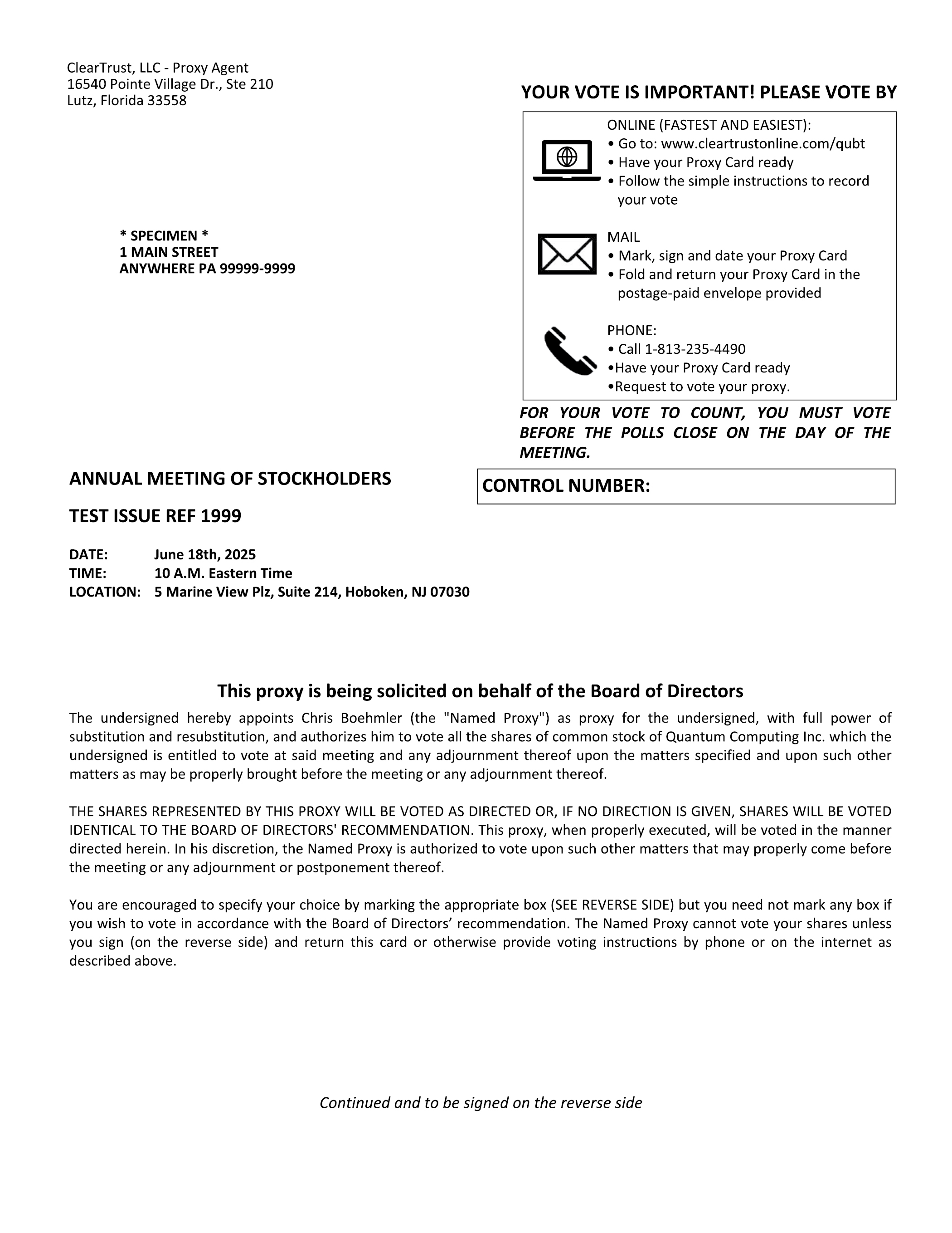 ClearTrust, LLC - Proxy Agent 16540 Pointe Village Dr., Ste 210 Lutz, Florida 33558 * SPECIMEN * 1 MAIN STREET ANYWHERE PA 99999-9999 YOUR VOTE IS IMPORTANT! PLEASE VOTE BY ONLINE (FASTEST AND EASIEST): Go to: www.cleartrustonline.com/qubt Have your Proxy Card ready Follow the simple instructions to record your vote MAIL Mark, sign and date your Proxy Card Fold and return your Proxy Card in the postage-paid envelope provided PHONE: Call 1-813-235-4490 Have your Proxy Card ready Request to vote your proxy. FOR YOUR VOTE TO COUNT, YOU MUST VOTE BEFORE THE POLLS CLOSE ON THE DAY OF THE MEETING. ANNUAL MEETING OF STOCKHOLDERS CONTROL NUMBER: TEST ISSUE REF 1999 DATE: June 18th, 2025 TIME: 10 A.M. Eastern Time LOCATION: 5 Marine View Plz, Suite 214, Hoboken, NJ 07030 This proxy is being solicited on behalf of the Board of Directors The undersigned hereby appoints Chris Boehmler (the “Named Proxy”) as proxy for the undersigned, with full power of substitution and resubstitution, and authorizes him to vote all the shares of common stock of Quantum Computing Inc. which the undersigned is entitled to vote at said meeting and any adjournment thereof upon the matters specified and upon such other matters as may be properly brought before the meeting or any adjournment thereof. THE SHARES REPRESENTED BY THIS PROXY WILL BE VOTED AS DIRECTED OR, IF NO DIRECTION IS GIVEN, SHARES WILL BE VOTED IDENTICAL TO THE BOARD OF DIRECTORS’ RECOMMENDATION. This proxy, when properly executed, will be voted in the manner directed herein. In his discretion, the Named Proxy is authorized to vote upon such other matters that may properly come before the meeting or any adjournment or postponement thereof. You are encouraged to specify your choice by marking the appropriate box (SEE REVERSE SIDE) but you need not mark any box if you wish to vote in accordance with the Board of Directors’ recommendation. The Named Proxy cannot vote your shares unless you sign (on the reverse side) and return this card or otherwise provide voting instructions by phone or on the internet as described above. Continued and to be signed on the reverse side