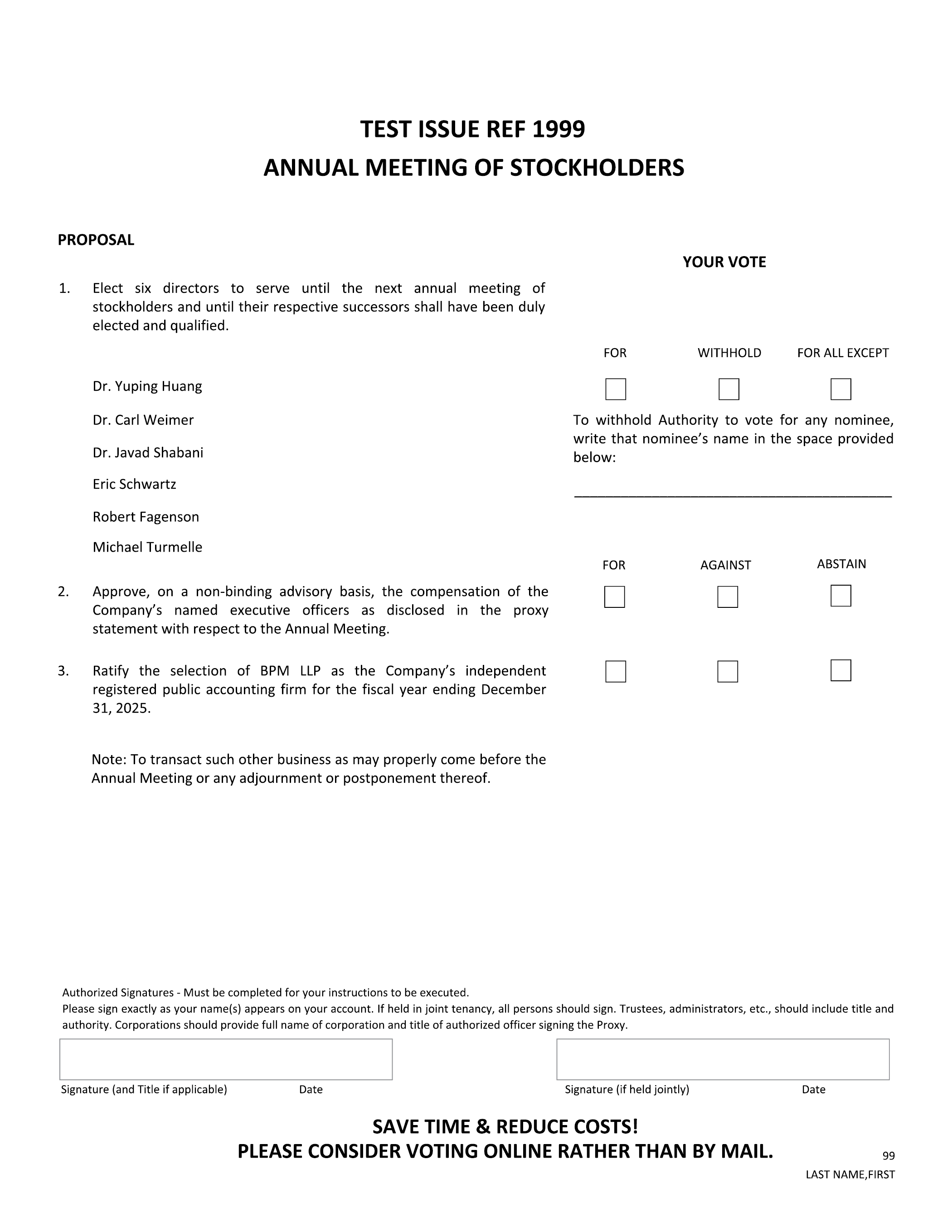 TEST ISSUE REF 1999 ANNUAL MEETING OF STOCKHOLDERS PROPOSAL 1. Elect six directors to serve until the next annual meeting of stockholders and until their respective successors shall have been duly elected and qualified. Dr. Yuping Huang Dr. Carl Weimer Dr. Javad Shabani Eric Schwartz Robert Fagenson Michael Turmelle YOUR VOTE FOR WITHHOLD FOR ALL EXCEPT To withhold Authority to vote for any nominee, write that nominee’s name in the space provided below: AGAINST ABSTAIN 2. Approve, on a non-binding advisory basis, the compensation of the Company’s named executive officers as disclosed in the proxy statement with respect to the Annual Meeting. 3. Ratify the selection of BPM LLP as the Company’s independent registered public accounting firm for the fiscal year ending December 31, 2025. Note: To transact such other business as may properly come before the Annual Meeting or any adjournment or postponement thereof. Authorized Signatures - Must be completed for your instructions to be executed. Please sign exactly as your name(s) appears on your account. If held in joint tenancy, all persons should sign. Trustees, administrators, etc., should include title and authority. Corporations should provide full name of corporation and title of authorized officer signing the Proxy. Signature (and Title if applicable) Date Signature (if held jointly) Date SAVE TIME & REDUCE COSTS! PLEASE CONSIDER VOTING ONLINE RATHER THAN BY MAIL. 99 LAST NAME,FIRST