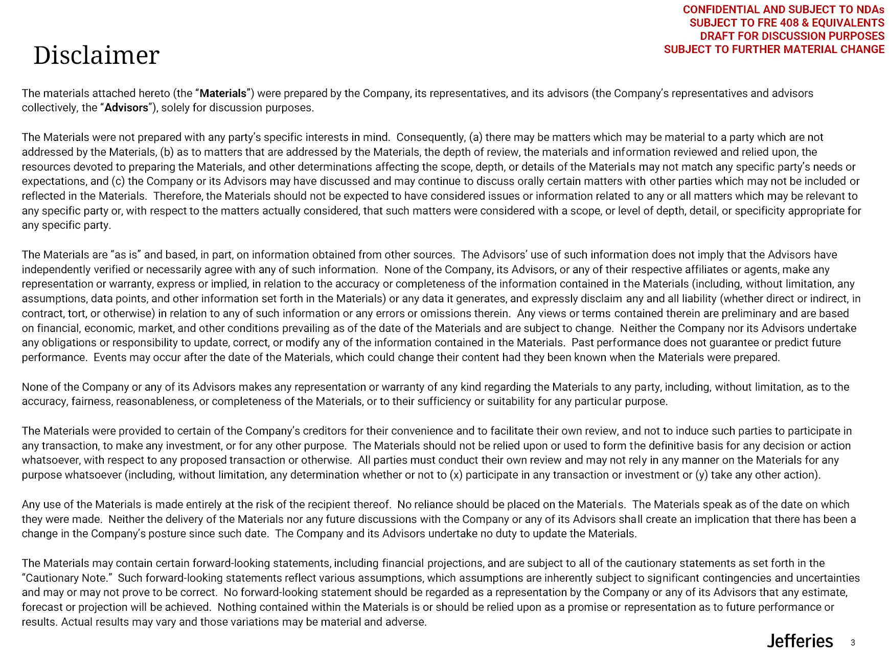 completeness of the Materials, or to their sufficiency or suitability for any particular purpose. The Materials were provided to certain of the Company’s creditors for their convenience and to facilitate their own review, and not to induce