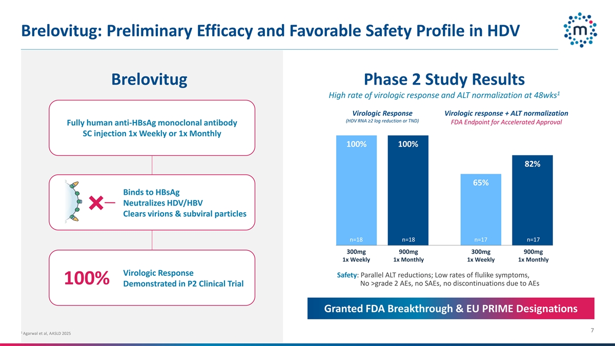HDV Is The Most Severe Form Of Viral Hepatitis No Approved Therapies in the US Hepatitis Delta Virus >50% ~15,000~ 1 Liver-Related Death in 10 Years 4 US pts diagnosed, insured, under care 5yrs 2 Avg. Progression to Cirrhosis and Liver Failure ~40,000 Est. US Prevalence >230,000 prevalence US/EU, >12M WW 3x Requires Hepatitis B coinfection 3 A significant global unmet need Risk of Liver Cancer (HCC) vs. HBV Hepatitis B Surface Antigen (HBsAg) necessary for HDV to replicate and spread 1 Negro, F. & Lok, A. S JAMA 2023 2 Miao et al, The Journal of Infectious Diseases 2019 3 Sagnelli, C. et al. HBV/HDV Co-Infection: Epidemiological and Clinical Changes, Recent Knowledge and Future Challenges. Life 11, 169 (2021). 6 4 Mirum estimates