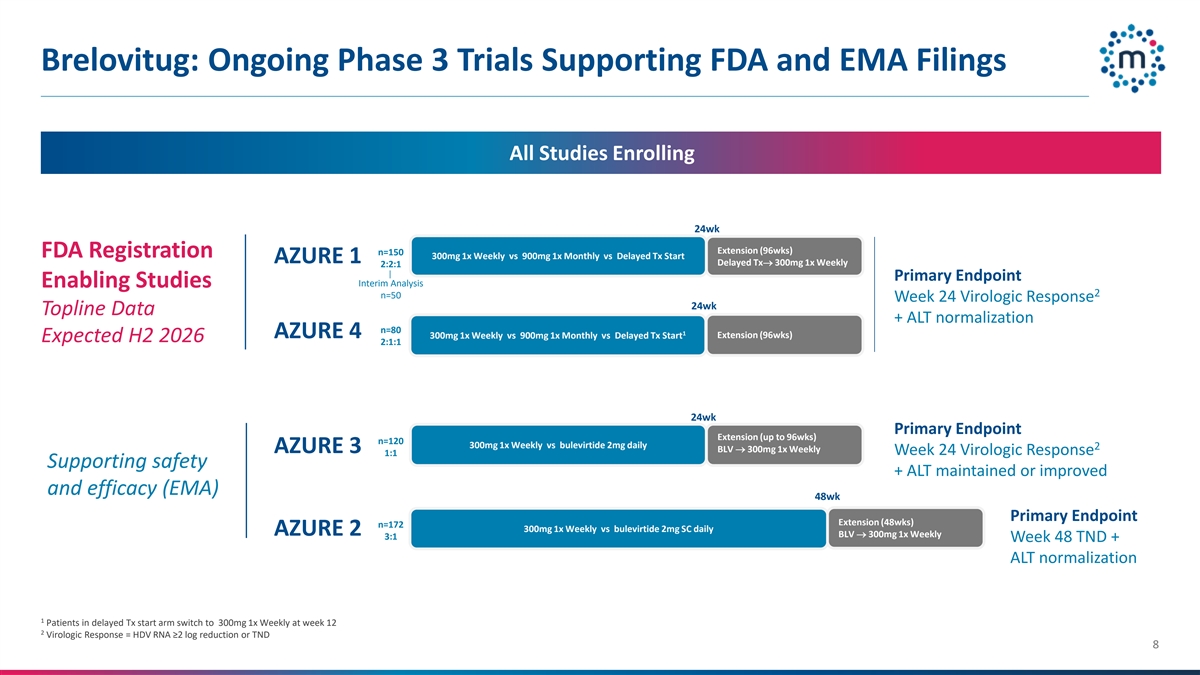Brelovitug: Preliminary Efficacy and Favorable Safety Profile in HDV Brelovitug Phase 2 Study Results 1 High rate of virologic response and ALT normalization at 48wks Virologic Response Virologic response + ALT normalization (HDV RNA ≥2 log reduction or TND) FDA Endpoint for Accelerated Approval Fully human anti-HBsAg monoclonal antibody SC injection 1x Weekly or 1x Monthly 100% 100% 82% 65% Binds to HBsAg Neutralizes HDV/HBV Clears virions & subviral particles n=18 n=18 n=17 n=17 300mg 900mg 300mg 900mg 1x Weekly 1x Monthly 1x Weekly 1x Monthly Virologic Response Safety: Parallel ALT reductions; Low rates of flulike symptoms, 100% No >grade 2 AEs, no SAEs, no discontinuations due to AEs Demonstrated in P2 Clinical Trial Granted FDA Breakthrough & EU PRIME Designations 7 1 Agarwal et al, AASLD 2025