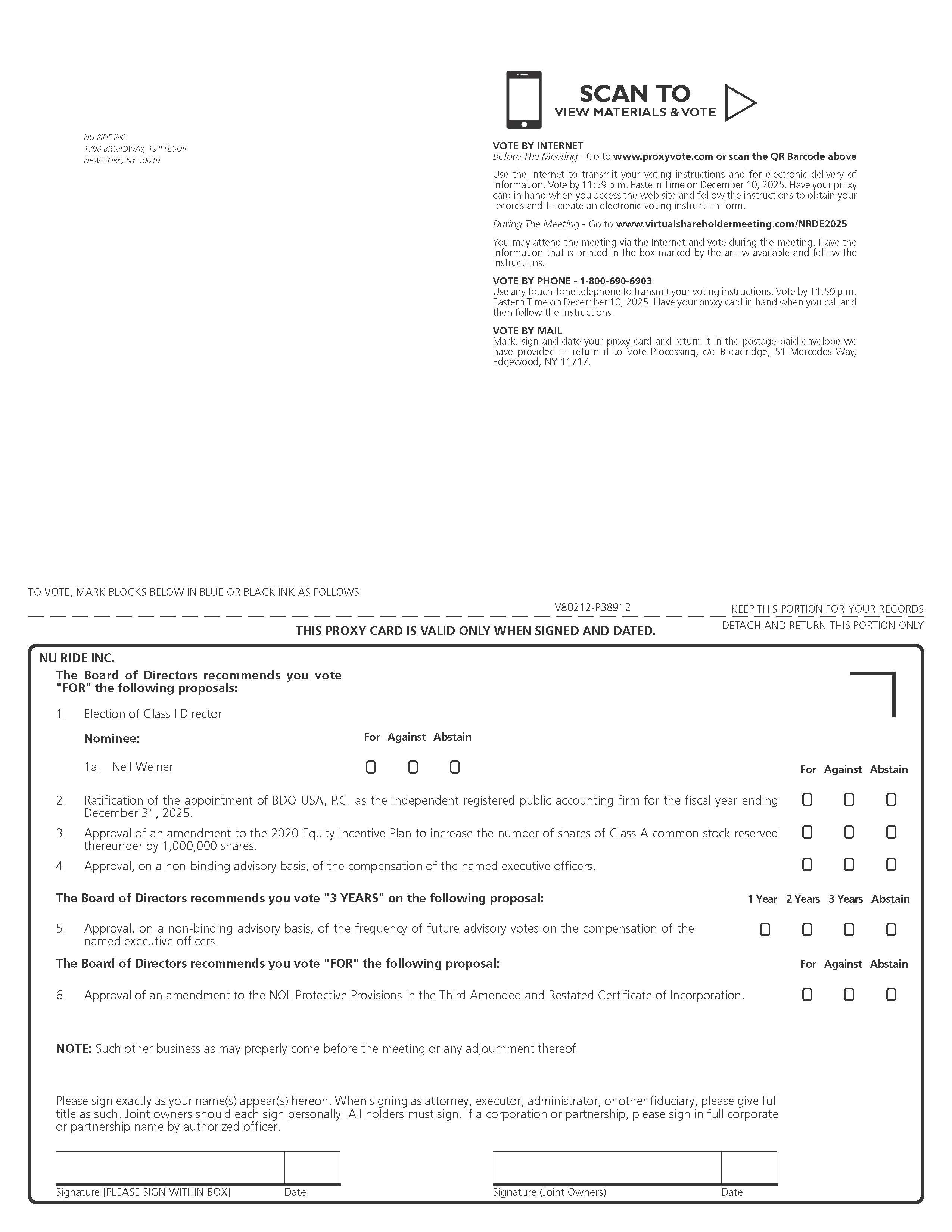 We are pleased to inform you that the 2025 Annual Meeting of Stockholders (the “2025 Annual Meeting”) of Nu Ride Inc. (the “Company,” “we,” “us” or “our”) will be held on Thursday, December 11, 2025, at 12:00 pm New York City time. The 2025 Annual Meeting will be completely virtual and conducted via live audio webcast to enable our stockholders to participate from any location around the world that is convenient to them. You will be able to attend the virtual Annual Meeting online and submit your questions during the virtual Annual Meeting by visiting www.virtualshareholdermeeting.com/NRDE2025. Stockholders will be able to listen, vote and submit questions during the virtual meeting. The agenda of the 2025 Annual Meeting will be the following items of business, which are more fully described in this proxy statement: