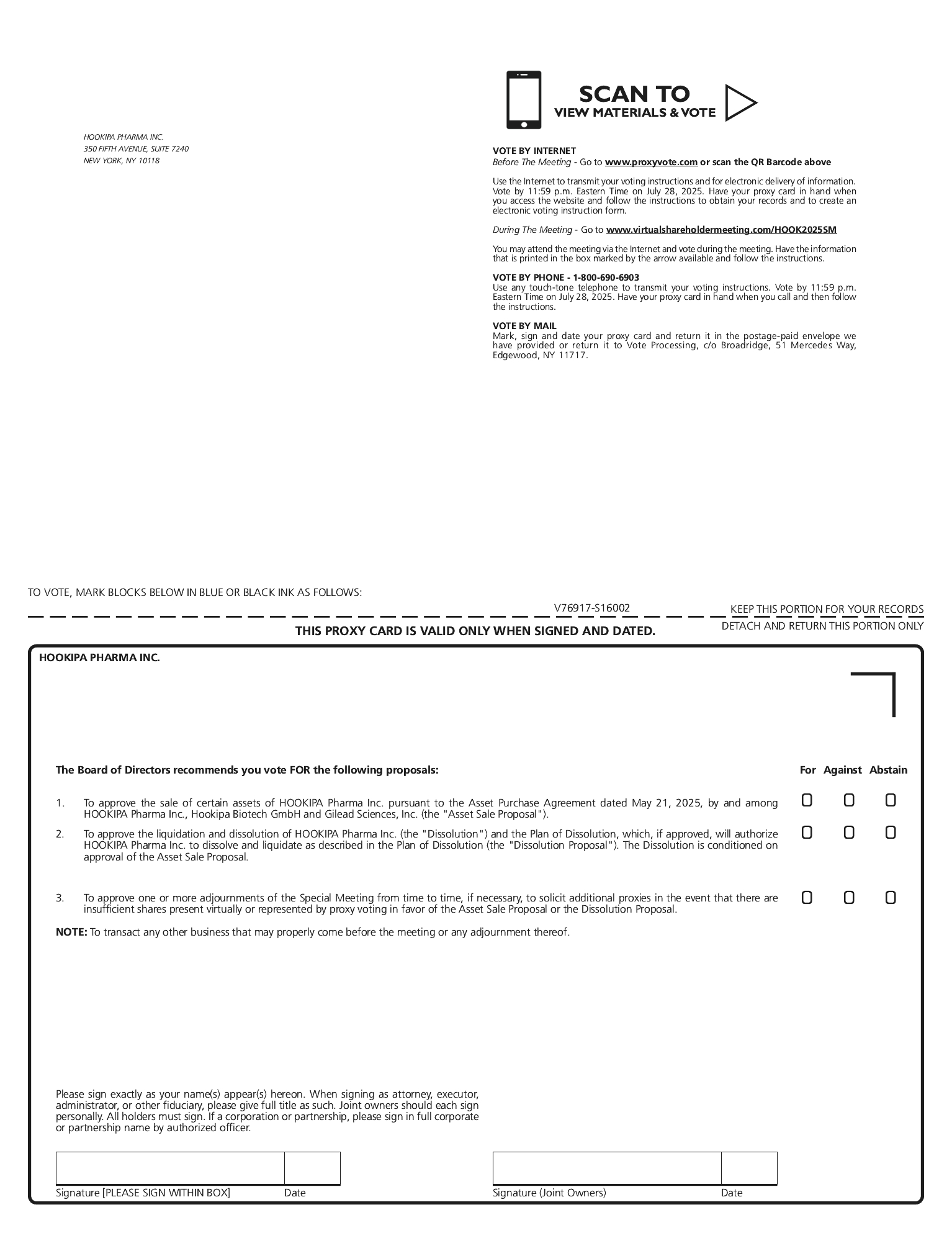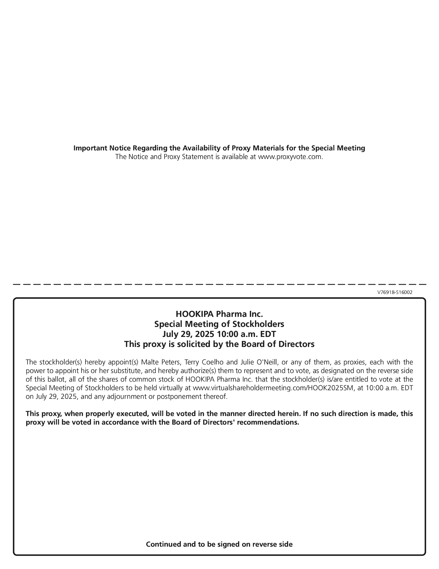 You are cordially invited to attend a special meeting of stockholders (the “Special Meeting”) of HOOKIPA Pharma Inc., a Delaware corporation (the “Company,” “HOOKIPA,” “we,” “us,” or “our”), to be held on July 29, 2025, at 10:00 a.m. Eastern Time.