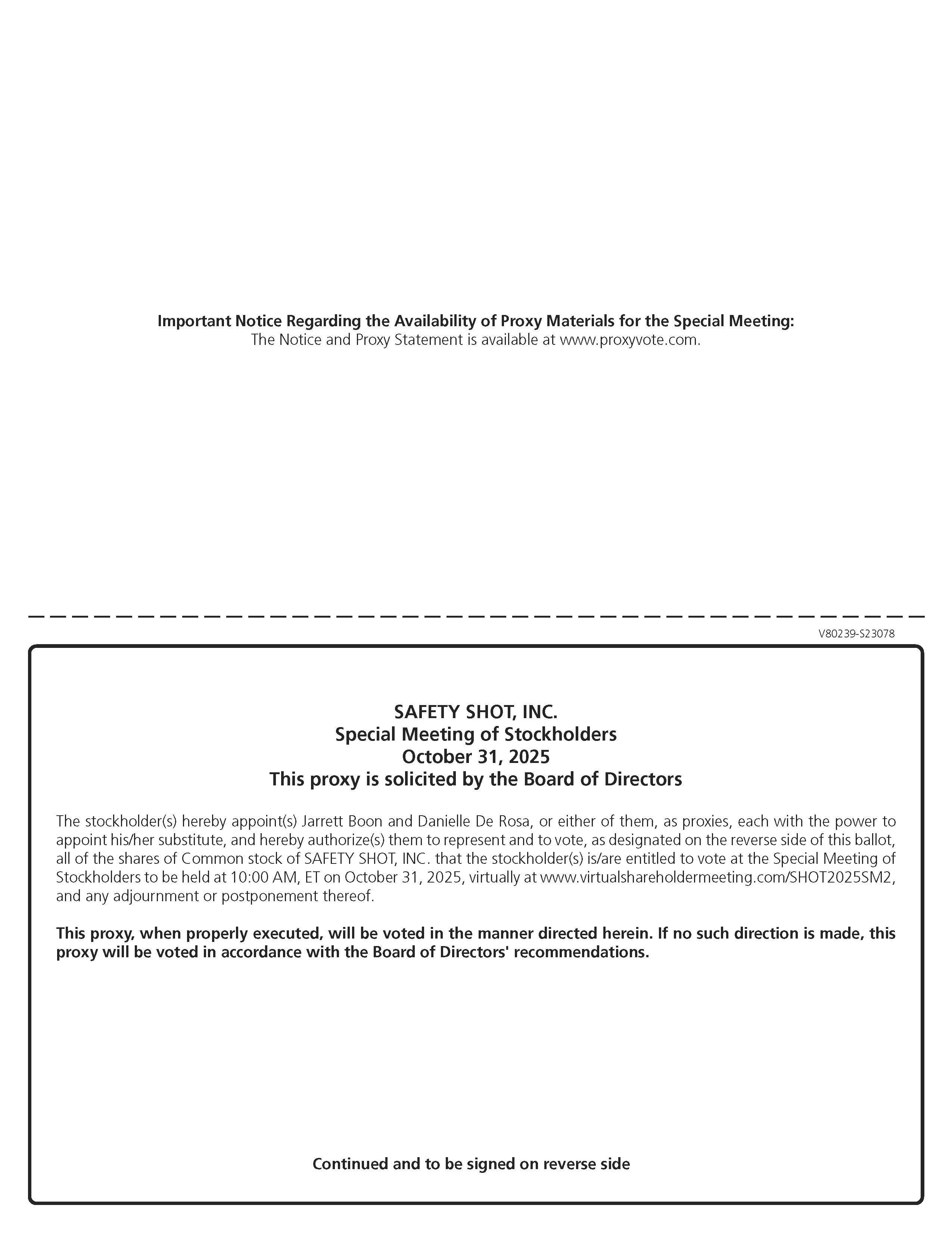 We cordially invite you to attend a special meeting of stockholders (the “Special Meeting”) of Safety Shot, Inc., a Delaware corporation (the “Company”), which will be held on October 31, 2025 at 10:00 a.m. Eastern Time, in a virtual-only meeting format via live webcast on the Internet. The meeting will be held for the following purposes: