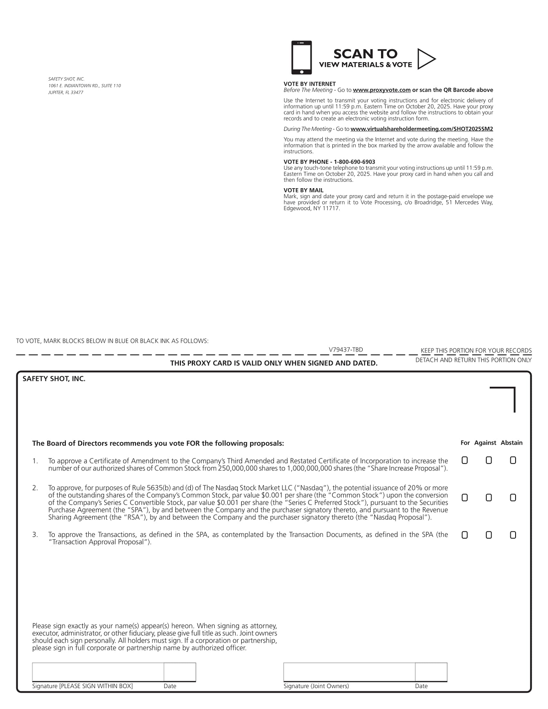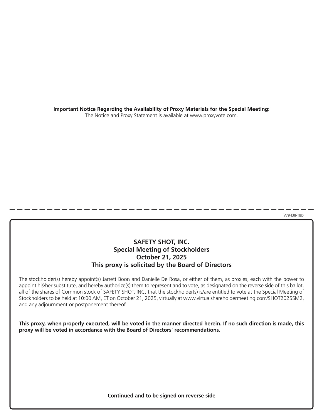 We cordially invite you to attend a special meeting of stockholders (the “Special Meeting”) of Safety Shot, Inc., a Delaware corporation (the “Company”), which will be held on October 21, 2025 at 10:00 a.m. Eastern Time, in a virtual-only meeting format via live webcast on the Internet. The meeting will be held for the following purposes: