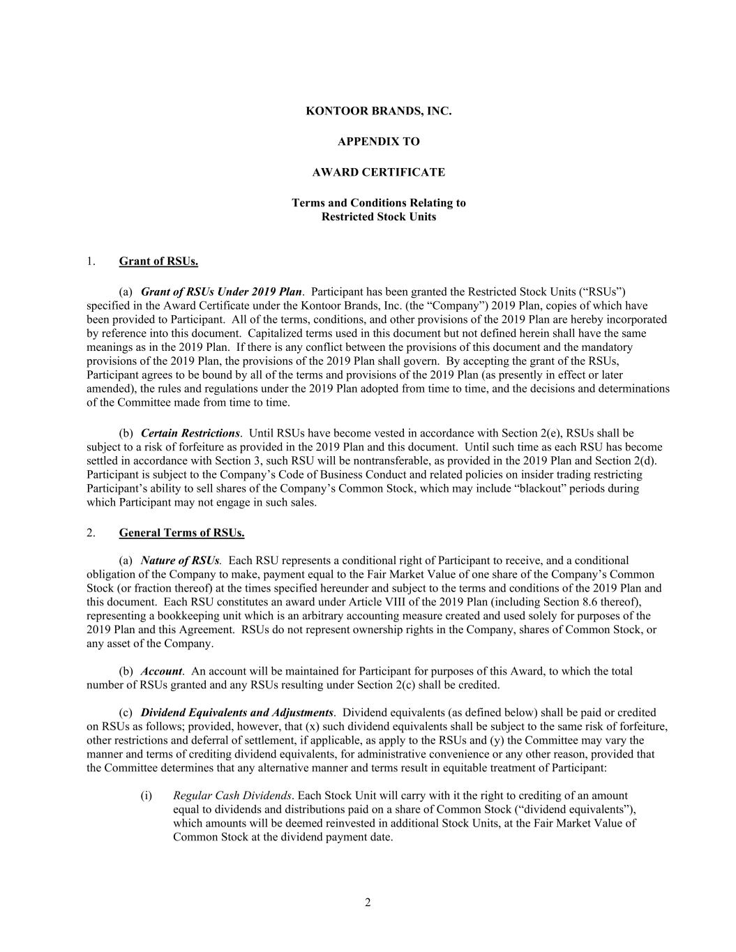 2 KONTOOR BRANDS, INC. APPENDIX TO AWARD CERTIFICATE Terms and Conditions Relating to Restricted Stock Units 1. Grant of RSUs. (a) Grant of RSUs Under 2019 Plan. Participant has been granted the Restricted Stock Units (“RSUs”) specified in the Award Certificate under the Kontoor Brands, Inc. (the “Company”) 2019 Plan, copies of which have been provided to Participant. All of the terms, conditions, and other provisions of the 2019 Plan are hereby incorporated by reference into this document. Capitalized terms used in this document but not defined herein shall have the same meanings as in the 2019 Plan. If there is any conflict between the provisions of this document and the mandatory provisions of the 2019 Plan, the provisions of the 2019 Plan shall govern. By accepting the grant of the RSUs, Participant agrees to be bound by all of the terms and provisions of the 2019 Plan (as presently in effect or later amended), the rules and regulations under the 2019 Plan adopted from time to time, and the decisions and determinations of the Committee made from time to time. (b) Certain Restrictions. Until RSUs have become vested in accordance with Section 2(e), RSUs shall be subject to a risk of forfeiture as provided in the 2019 Plan and this document. Until such time as each RSU has become settled in accordance with Section 3, such RSU will be nontransferable, as provided in the 2019 Plan and Section 2(d). Participant is subject to the Company’s Code of Business Conduct and related policies on insider trading restricting Participant’s ability to sell shares of the Company’s Common Stock, which may include “blackout” periods during which Participant may not engage in such sales. 2. General Terms of RSUs. (a) Nature of RSUs. Each RSU represents a conditional right of Participant to receive, and a conditional obligation of the Company to make, payment equal to the Fair Market Value of one share of the Company’s Common Stock (or fraction thereof) at the times specified hereunder and subject to the terms and conditions of the 2019 Plan and this document. Each RSU constitutes an award under Article VIII of the 2019 Plan (including Section 8.6 thereof), representing a bookkeeping unit which is an arbitrary accounting measure created and used solely for purposes of the 2019 Plan and this Agreement. RSUs do not represent ownership rights in the Company, shares of Common Stock, or any asset of the Company. (b) Account. An account will be maintained for Participant for purposes of this Award, to which the total number of RSUs granted and any RSUs resulting under Section 2(c) shall be credited. (c) Dividend Equivalents and Adjustments. Dividend equivalents (as defined below) shall be paid or credited on RSUs as follows; provided, however, that (x) such dividend equivalents shall be subject to the same risk of forfeiture, other restrictions and deferral of settlement, if applicable, as apply to the RSUs and (y) the Committee may vary the manner and terms of crediting dividend equivalents, for administrative convenience or any other reason, provided that the Committee determines that any alternative manner and terms result in equitable treatment of Participant: (i) Regular Cash Dividends. Each Stock Unit will carry with it the right to crediting of an amount equal to dividends and distributions paid on a share of Common Stock (“dividend equivalents”), which amounts will be deemed reinvested in additional Stock Units, at the Fair Market Value of Common Stock at the dividend payment date.