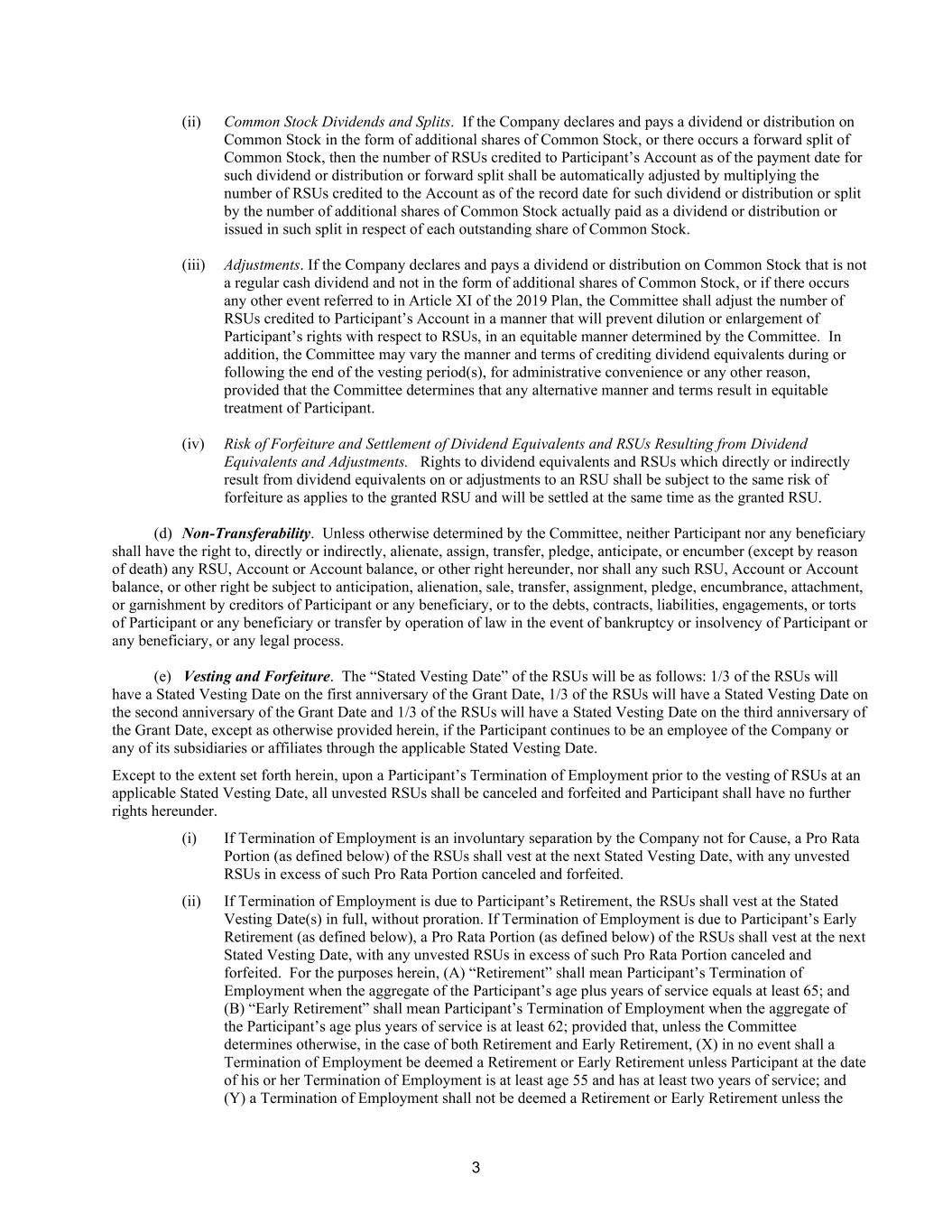 3 (ii) Common Stock Dividends and Splits. If the Company declares and pays a dividend or distribution on Common Stock in the form of additional shares of Common Stock, or there occurs a forward split of Common Stock, then the number of RSUs credited to Participant’s Account as of the payment date for such dividend or distribution or forward split shall be automatically adjusted by multiplying the number of RSUs credited to the Account as of the record date for such dividend or distribution or split by the number of additional shares of Common Stock actually paid as a dividend or distribution or issued in such split in respect of each outstanding share of Common Stock. (iii) Adjustments. If the Company declares and pays a dividend or distribution on Common Stock that is not a regular cash dividend and not in the form of additional shares of Common Stock, or if there occurs any other event referred to in Article XI of the 2019 Plan, the Committee shall adjust the number of RSUs credited to Participant’s Account in a manner that will prevent dilution or enlargement of Participant’s rights with respect to RSUs, in an equitable manner determined by the Committee. In addition, the Committee may vary the manner and terms of crediting dividend equivalents during or following the end of the vesting period(s), for administrative convenience or any other reason, provided that the Committee determines that any alternative manner and terms result in equitable treatment of Participant. (iv) Risk of Forfeiture and Settlement of Dividend Equivalents and RSUs Resulting from Dividend Equivalents and Adjustments. Rights to dividend equivalents and RSUs which directly or indirectly result from dividend equivalents on or adjustments to an RSU shall be subject to the same risk of forfeiture as applies to the granted RSU and will be settled at the same time as the granted RSU. (d) Non-Transferability. Unless otherwise determined by the Committee, neither Participant nor any beneficiary shall have the right to, directly or indirectly, alienate, assign, transfer, pledge, anticipate, or encumber (except by reason of death) any RSU, Account or Account balance, or other right hereunder, nor shall any such RSU, Account or Account balance, or other right be subject to anticipation, alienation, sale, transfer, assignment, pledge, encumbrance, attachment, or garnishment by creditors of Participant or any beneficiary, or to the debts, contracts, liabilities, engagements, or torts of Participant or any beneficiary or transfer by operation of law in the event of bankruptcy or insolvency of Participant or any beneficiary, or any legal process. (e) Vesting and Forfeiture. The “Stated Vesting Date” of the RSUs will be as follows: 1/3 of the RSUs will have a Stated Vesting Date on the first anniversary of the Grant Date, 1/3 of the RSUs will have a Stated Vesting Date on the second anniversary of the Grant Date and 1/3 of the RSUs will have a Stated Vesting Date on the third anniversary of the Grant Date, except as otherwise provided herein, if the Participant continues to be an employee of the Company or any of its subsidiaries or affiliates through the applicable Stated Vesting Date. Except to the extent set forth herein, upon a Participant’s Termination of Employment prior to the vesting of RSUs at an applicable Stated Vesting Date, all unvested RSUs shall be canceled and forfeited and Participant shall have no further rights hereunder. (i) If Termination of Employment is an involuntary separation by the Company not for Cause, a Pro Rata Portion (as defined below) of the RSUs shall vest at the next Stated Vesting Date, with any unvested RSUs in excess of such Pro Rata Portion canceled and forfeited. (ii) If Termination of Employment is due to Participant’s Retirement, the RSUs shall vest at the Stated Vesting Date(s) in full, without proration. If Termination of Employment is due to Participant’s Early Retirement (as defined below), a Pro Rata Portion (as defined below) of the RSUs shall vest at the next Stated Vesting Date, with any unvested RSUs in excess of such Pro Rata Portion canceled and forfeited. For the purposes herein, (A) “Retirement” shall mean Participant’s Termination of Employment when the aggregate of the Participant’s age plus years of service equals at least 65; and (B) “Early Retirement” shall mean Participant’s Termination of Employment when the aggregate of the Participant’s age plus years of service is at least 62; provided that, unless the Committee determines otherwise, in the case of both Retirement and Early Retirement, (X) in no event shall a Termination of Employment be deemed a Retirement or Early Retirement unless Participant at the date of his or her Termination of Employment is at least age 55 and has at least two years of service; and (Y) a Termination of Employment shall not be deemed a Retirement or Early Retirement unless the