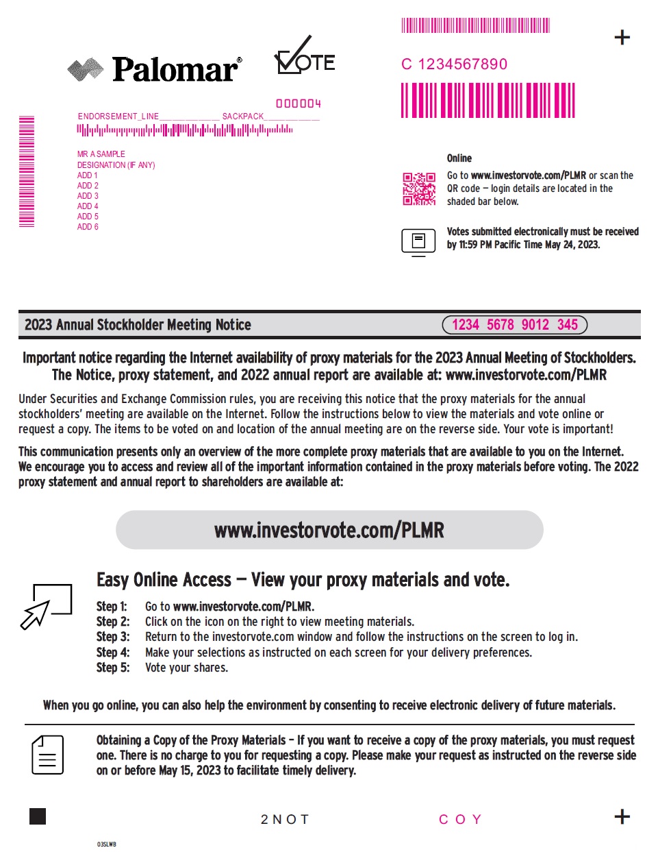 www.investorvote.com/PLMR Step 1: Go to www.investorvote.com/PLMR. Step 2: Click on the icon on the right to view meeting materials. Step 3: Return to the investorvote.com window and follow the instructions on the screen to log in. Online Go to www.investorvote.com/PLMR or scan the QR code — login details are located in the shaded bar below. 2023 Annual Stockholder Meeting Notice 03SLWB + + Obtaining a Copy of the Proxy Materials – If you want to receive a copy of the proxy materials, you must request one. There is no charge to you for requesting a copy. Please make your request as instructed on the reverse side on or before May 15, 2023 to facilitate timely delivery. 2 N O T Easy Online Access — View your proxy materials and vote. When you go online, you can also help the environment by consenting to receive electronic delivery of future materials. Votes submitted electronically must be received by 11:59 PM Pacific Time May 24, 2023. Step 4: Make your selections as instructed on each screen for your delivery preferences. Step 5: Vote your shares. Important notice regarding the Internet availability of proxy materials for the 2023 Annual Meeting of Stockholders. The Notice, proxy statement, and 2022 annual report are available at: www.investorvote.com/PLMR Under Securities and Exchange Commission rules, you are receiving this notice that the proxy materials for the annual stockholders’ meeting are available on the Internet. Follow the instructions below to view the materials and vote online or request a copy. The items to be voted on and location of the annual meeting are on the reverse side. Your vote is important! This communication presents only an overview of the more complete proxy materials that are available to you on the Internet. We encourage you to access and review all of the important information contained in the proxy materials before voting. The 2022 proxy statement and annual report to shareholders are available at: MMMMMMMMMMMM MMMMMMMMM MR A SAMPLE DESIGNATION (IF ANY) ADD 1 ADD 2 ADD 3 ADD 4 ADD 5 ADD 6 ENDORSEMENT_LINE______________ SACKPACK_____________ 1234 5678 9012 345 C 1234567890 C O Y 000004 MMMMMMM