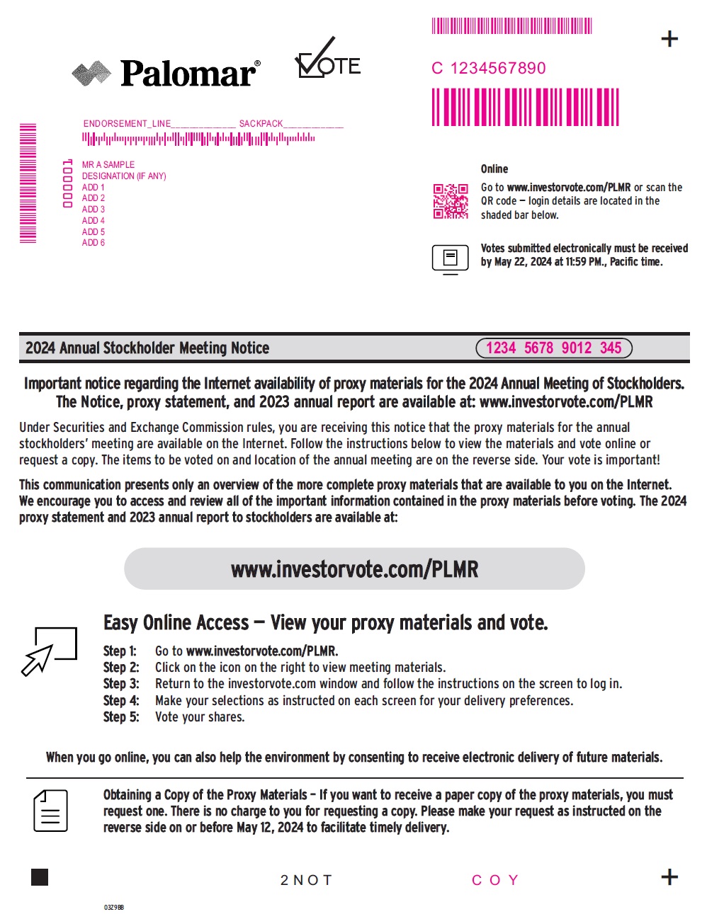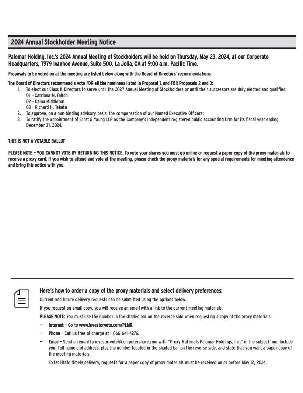 Here’s how to order a copy of the proxy materials and select delivery preferences: Current and future delivery requests can be submitted using the options below. If you request an email copy, you will receive an email with a link to the current meeting materials. PLEASE NOTE: You must use the number in the shaded bar on the reverse side when requesting a copy of the proxy materials. — Internet – Go to www.investorvote.com/PLMR. — Phone – Call us free of charge at 1-866-641-4276. — Email – Send an email to investorvote@computershare.com with “Proxy Materials Palomar Holdings, Inc.” in the subject line. Include your full name and address, plus the number located in the shaded bar on the reverse side, and state that you want a paper copy of the meeting materials. To facilitate timely delivery, requests for a paper copy of proxy materials must be received on or before May 12, 2024. Palomar Holding, Inc.’s 2024 Annual Meeting of Stockholders will be held on Thursday, May 23, 2024, at our Corporate Headquarters, 7979 Ivanhoe Avenue, Suite 500, La Jolla, CA at 9:00 a.m. Pacific Time. Proposals to be voted on at the meeting are listed below along with the Board of Directors’ recommendations. The Board of Directors recommend a vote FOR all the nominees listed in Proposal 1, and FOR Proposals 2 and 3: 1. To elect our Class II Directors to serve until the 2027 Annual Meeting of Stockholders or until their successors are duly elected and qualified; 01 - Catriona M. Fallon 02 - Daina Middleton 03 - Richard H. Taketa 2. To approve, on a non-binding advisory basis, the compensation of our Named Executive Officers; 3. To ratify the appointment of Ernst & Young LLP as the Company’s independent registered public accounting firm for its fiscal year ending December 31, 2024. THIS IS NOT A VOTABLE BALLOT PLEASE NOTE – YOU CANNOT VOTE BY RETURNING THIS NOTICE. To vote your shares you must go online or request a paper copy of the proxy materials to receive a proxy card. If you wish to attend and vote at the meeting, please check the proxy materials for any special requirements for meeting attendance and bring this notice with you. 2024 Annual Stockholder Meeting Notice
