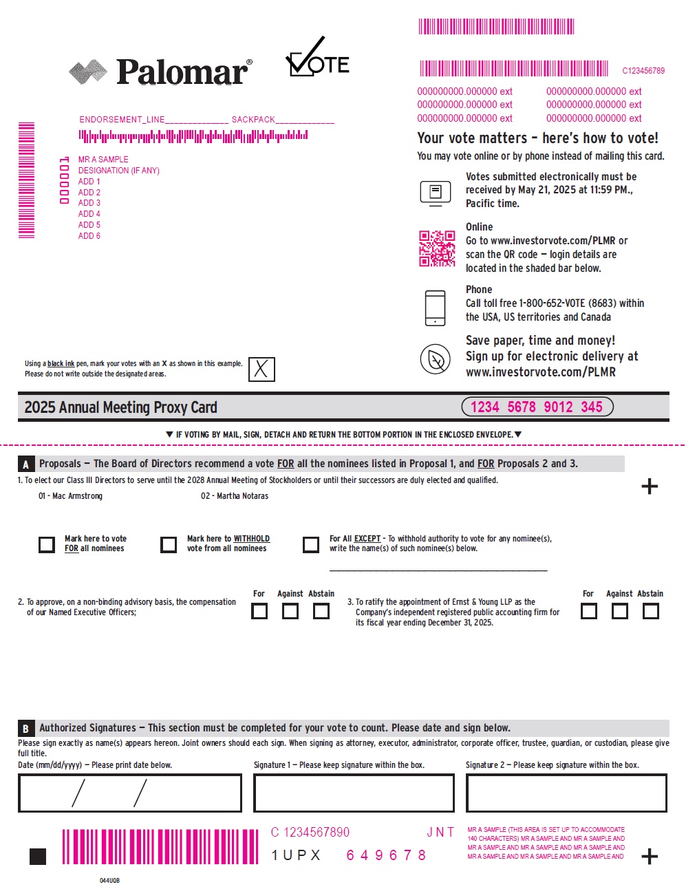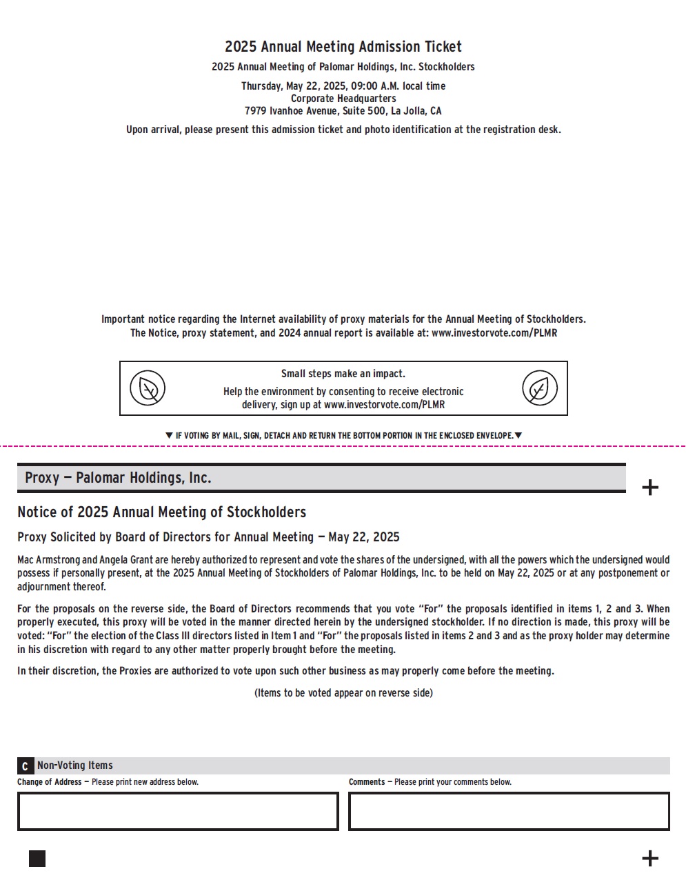 Small steps make an impact. Help the environment by consenting to receive electronic delivery, sign up at www.investorvote.com/PLMR Notice of 2025 Annual Meeting of Stockholders Proxy Solicited by Board of Directors for Annual Meeting — May 22, 2025 Mac Armstrong and Angela Grant are hereby authorized to represent and vote the shares of the undersigned, with all the powers which the undersigned would possess if personally present, at the 2025 Annual Meeting of Stockholders of Palomar Holdings, Inc. to be held on May 22, 2025 or at any postponement or adjournment thereof. For the proposals on the reverse side, the Board of Directors recommends that you vote “For” the proposals identified in items 1, 2 and 3. When properly executed, this proxy will be voted in the manner directed herein by the undersigned stockholder. If no direction is made, this proxy will be voted: “For” the election of the Class III directors listed in Item 1 and “For” the proposals listed in items 2 and 3 and as the proxy holder may determine in his discretion with regard to any other matter properly brought before the meeting. In their discretion, the Proxies are authorized to vote upon such other business as may properly come before the meeting. (Items to be voted appear on reverse side) Proxy — Palomar Holdings, Inc. Non-Voting Items C q IF VOTING BY MAIL, SIGN, DETACH AND RETURN THE BOTTOM PORTION IN THE ENCLOSED ENVELOPE.q Change of Address — Please print new address below. Comments — Please print your comments below. Important notice regarding the Internet availability of proxy materials for the Annual Meeting of Stockholders. The Notice, proxy statement, and 2024 annual report is available at: www.investorvote.com/PLMR 2025 Annual Meeting Admission Ticket 2025 Annual Meeting of Palomar Holdings, Inc. Stockholders Thursday, May 22, 2025, 09:00 A.M. local time Corporate Headquarters 7979 Ivanhoe Avenue, Suite 500, La Jolla, CA Upon arrival, please present this admission ticket and photo identification at the registration desk.
