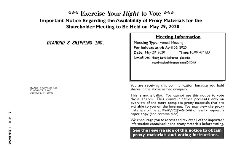 See the reverse side of this notice to obtain proxy materials and voting instructions. *** Exercise Your Right to Vote *** Important Notice Regarding the Availability of Proxy Materials for the Shareholder Meeting to Be Held on <mtgdate>. You are receiving this communication because you hold shares in the above named company. This is not a ballot. You cannot use this notice to vote these shares. This communication presents only an overview of the more complete proxy materials that are available to you on the Internet. You may view the proxy materials online at www.proxyvote.com or easily request a paper copy (see reverse side). We encourage you to access and review all of the important information contained in the proxy materials before voting. Meeting Information Meeting Type: <mtgtype> For holders as of: <recdate> Date: Time: <mtgtime> Location: 0000459953_1 R1.0.1.18 DIAMOND S SHIPPING INC. DIAMOND S SHIPPING INC. 33 BENEDICT PLACE GREENWICH, CT 06830 Annual Meeting April 06, 2020 May 29, 2020 May 29, 2020 10:00 AM EDT Meeting live via the Internet - please visit www.virtualshareholdermeeting.com/DSSI2020