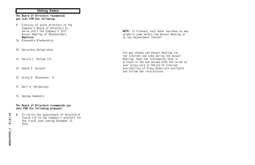 Voting items 0000459953_3 R1.0.1.18 The Board of Directors recommends you vote FOR the following: 1. Election of seven directors to the Company's Board of Directors to serve until the Company's 2021 Annual Meeting of Shareholders. Nominees 1A Alexandra Blankenship 1B Gerasimos Kalogiratos 1C Harold L. Malone III 1D Nadim Z. Qureshi 1E Craig H. Stevenson, Jr. 1F Bart H. Veldhuizen 1G George Cambanis The Board of Directors recommends you vote FOR the following proposal: 2 To ratify the appointment of Deloitte & Touche LLP as the Company's auditors for the fiscal year ending December 31, 2020. NOTE: To transact such other business as may properly come before the Annual Meeting or at any adjournment thereof. You may attend the Annual Meeting via the Internet and vote during the Annual Meeting. Have the information that is printed in the box marked with the arrow on your proxy card or Notice of Internet Availability of Proxy Materials available and follow the instructions.