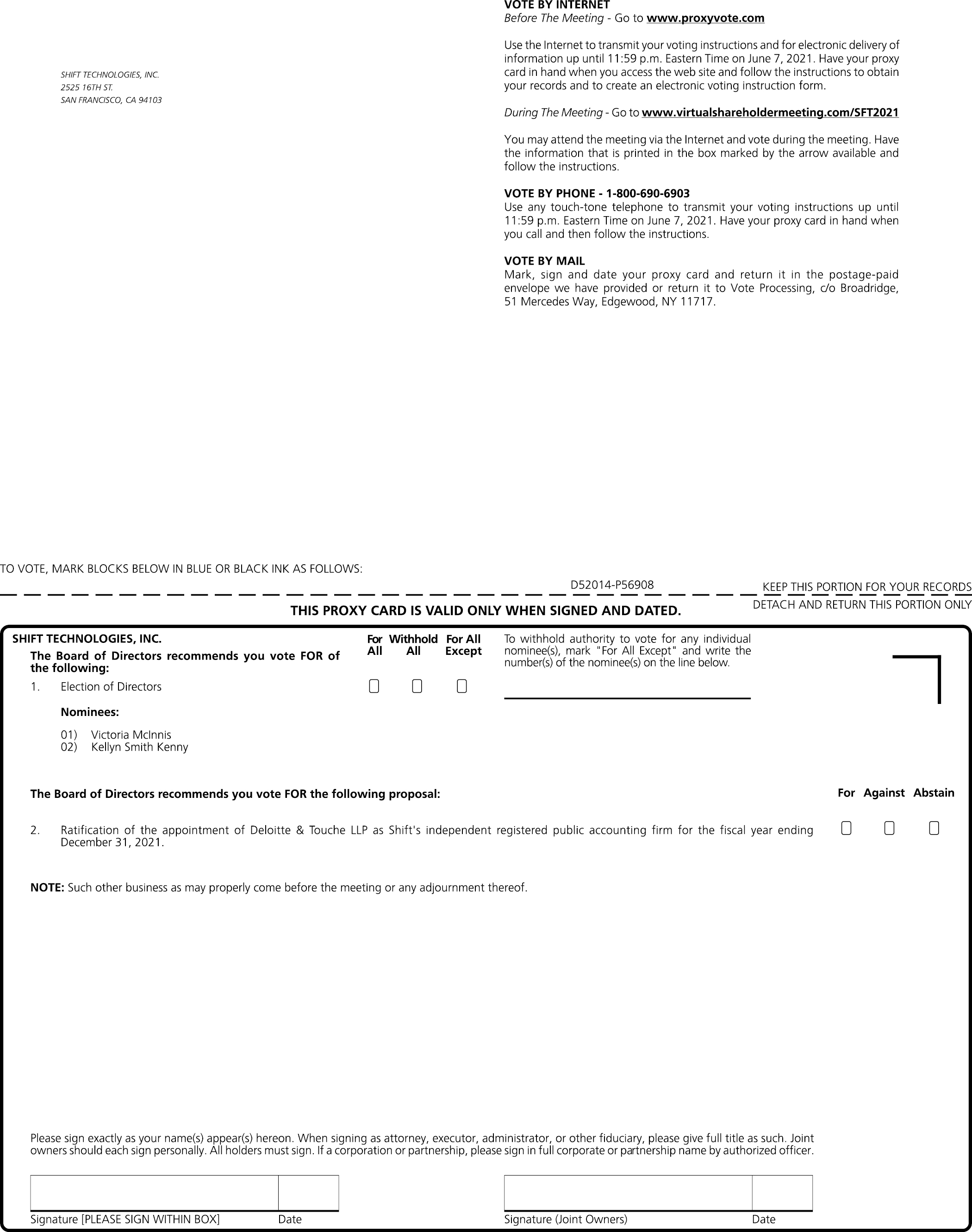 TO VOTE, MARK BLOCKS BELOW IN BLUE OR BLACK INK AS FOLLOWS: KEEP THIS PORTION FOR YOUR RECORDS THIS PROXY CARD IS VALID ONLY WHEN SIGNED AND DATED. DETACH AND RETURN THIS PORTION ONLY D52014-P56908 Nominees: 01) Victoria McInnis 02) Kellyn Smith Kenny 2. Ratification of the appointment of Deloitte & Touche LLP as Shift’s independent registered public accounting firm for the fiscal year ending December 31, 2021. Please sign exactly as your name(s) appear(s) hereon. When signing as attorney, executor, administrator, or other fiduciary, please give full title as such. Joint owners should each sign personally. All holders must sign. If a corporation or partnership, please sign in full corporate or partnership name by authorized officer. NOTE: Such other business as may properly come before the meeting or any adjournment thereof. 1. Election of Directors ! ! ! For All Withhold All For All Except For Against Abstain To withhold authority to vote for any individual nominee(s), mark “For All Except” and write the The Board of Directors recommends you vote FOR of number(s) of the nominee(s) on the line below. the following: The Board of Directors recommends you vote FOR the following proposal: SHIFT TECHNOLOGIES, INC. 2525 16TH ST. SAN FRANCISCO, CA 94103 ! ! ! SHIFT TECHNOLOGIES, INC. VOTE BY INTERNET Before The Meeting - Go to www.proxyvote.com Use the Internet to transmit your voting instructions and for electronic delivery of information up until 11:59 p.m. Eastern Time on June 7, 2021. Have your proxy card in hand when you access the web site and follow the instructions to obtain your records and to create an electronic voting instruction form. During The Meeting - Go to www.virtualshareholdermeeting.com/SFT2021 You may attend the meeting via the Internet and vote during the meeting. Have the information that is printed in the box marked by the arrow available and follow the instructions. VOTE BY PHONE - 1-800-690-6903 Use any touch-tone telephone to transmit your voting instructions up until 11:59 p.m. Eastern Time on June 7, 2021. Have your proxy card in hand when you call and then follow the instructions. VOTE BY MAIL Mark, sign and date your proxy card and return it in the postage-paid envelope we have provided or return it to Vote Processing, c/o Broadridge, 51 Mercedes Way, Edgewood, NY 11717. Signature [PLEASE SIGN WITHIN BOX] Date Signature (Joint Owners) Date