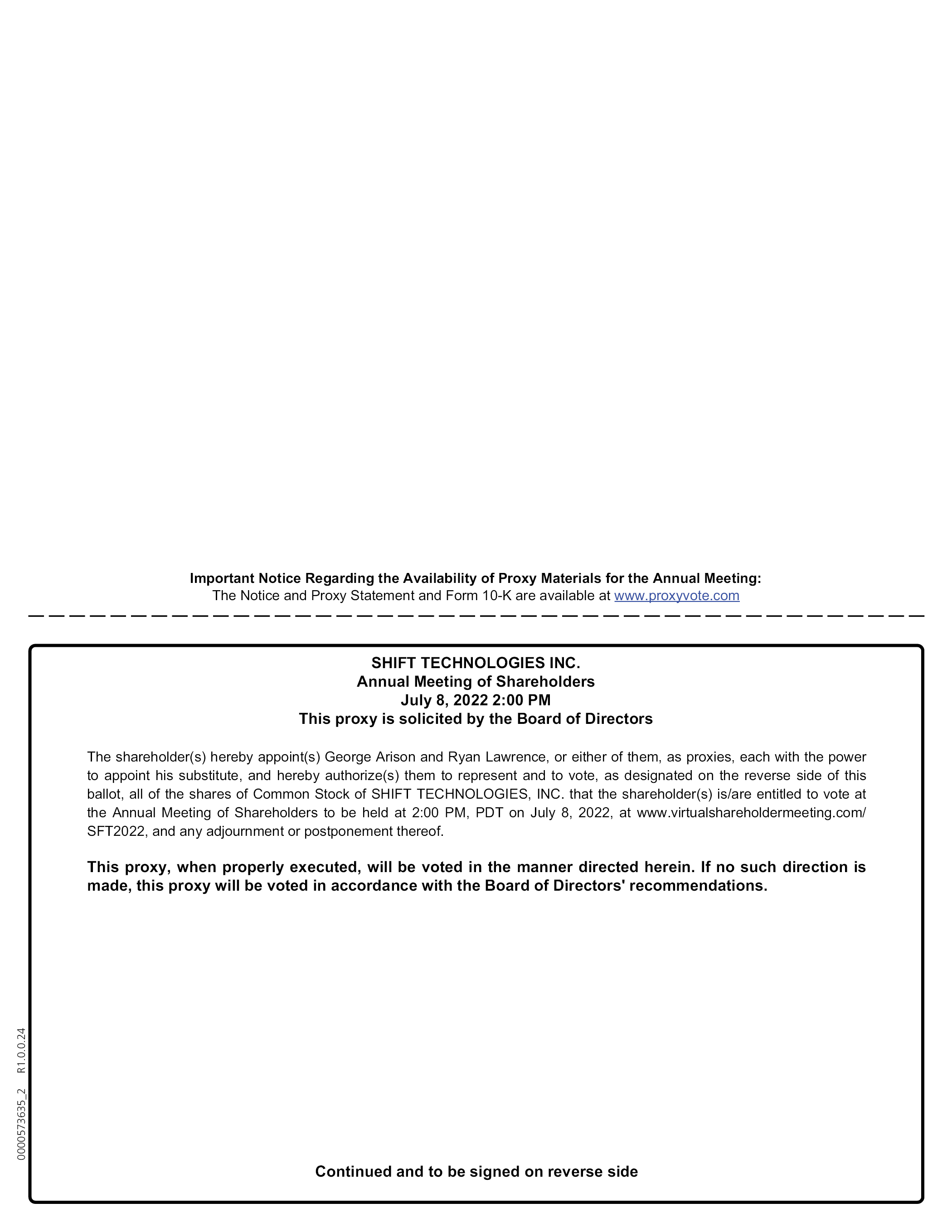 Important Notice Regarding the Availability of Proxy Materials for the Annual Meeting: The Notice and Proxy Statement and Form 10-K are available at www.proxyvote.com SHIFT TECHNOLOGIES INC. Annual Meeting of Shareholders July 8, 2022 2:00 PM This proxy is solicited by the Board of Directors The shareholder(s) hereby appoint(s) George Arison and Ryan Lawrence, or either of them, as proxies, each with the power to appoint his substitute, and hereby authorize(s) them to represent and to vote, as designated on the reverse side of this ballot, all of the shares of Common Stock of SHIFT TECHNOLOGIES, INC. that the shareholder(s) is/are entitled to vote at the Annual Meeting of Shareholders to be held at 2:00 PM, PDT on July 8, 2022, at www.virtualshareholdermeeting.com/ SFT2022, and any adjournment or postponement thereof. This proxy, when properly executed, will be voted in the manner directed herein. If no such direction is made, this proxy will be voted in accordance with the Board of Directors’ recommendations. Continued and to be signed on reverse side 0000573635_2 R1.0.0.24