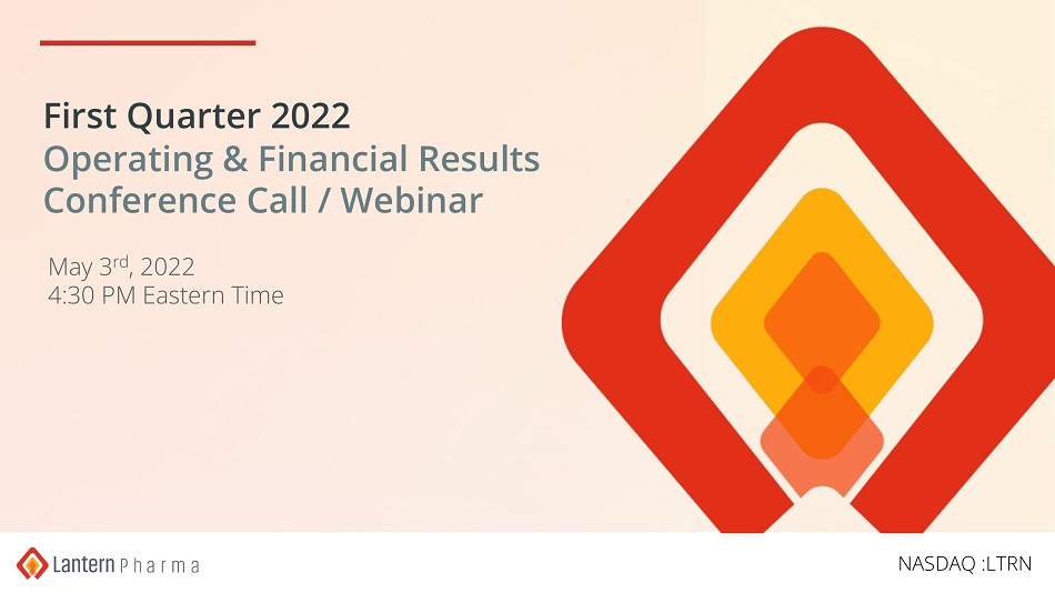 | ● | A replay of the Q1 2022 earnings call and webinar will be available at https://ir.lanternpharma.com. |