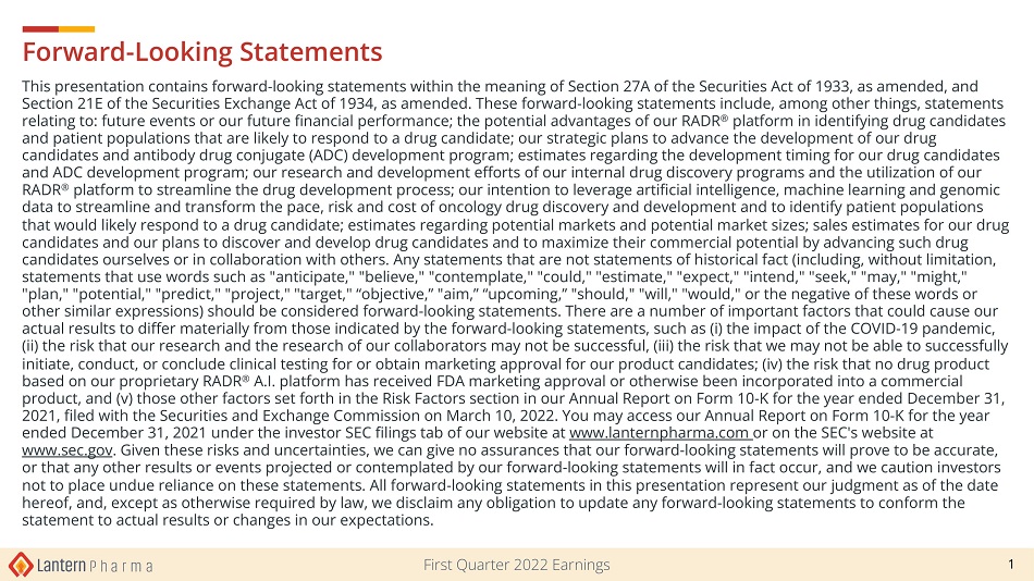 This press release contains forward-looking statements within the meaning of Section 27A of the Securities Act of 1933, as amended, and Section 21E of the Securities Exchange Act of 1934, as amended. These forward-looking statements include, among other things, statements relating to: future events or our future financial performance; the potential advantages of our RADR® platform in identifying drug candidates and patient populations that are likely to respond to a drug candidate; our strategic plans to advance the development of our drug candidates and antibody drug conjugate (ADC) development program; estimates regarding the development timing for our drug candidates and ADC development program; our research and development efforts of our internal drug discovery programs and the utilization of our RADR® platform to streamline the drug development process; our intention to leverage artificial intelligence, machine learning and genomic data to streamline and transform the pace, risk and cost of oncology drug discovery and development and to identify patient populations that would likely respond to a drug candidate; estimates regarding potential markets and potential market sizes; sales estimates for our drug candidates and our plans to discover and develop drug candidates and to maximize their commercial potential by advancing such drug candidates ourselves or in collaboration with others. Any statements that are not statements of historical fact (including, without limitation, statements that use words such as “anticipate,” “believe,” “contemplate,” “could,” “estimate,” “expect,” “intend,” “seek,” “may,” “might,” “plan,” “potential,” “predict,” “project,” “target,” “objective,” “aim,” “upcoming,” “should,” “will,” “would,” or the negative of these words or other similar expressions) should be considered forward-looking statements. There are a number of important factors that could cause our actual results to differ materially from those indicated by the forward-looking statements, such as (i) the impact of the COVID-19 pandemic, (ii) the risk that our research and the research of our collaborators may not be successful, (iii) the risk that none of our product candidates has received FDA marketing approval, and we may not be able to successfully initiate, conduct, or conclude clinical testing for or obtain marketing approval for our product candidates, (iv) the risk that no drug product based on our proprietary RADR® A.I. platform has received FDA marketing approval or otherwise been incorporated into a commercial product, and (v) those other factors set forth in the Risk Factors section in our Annual Report on Form 10-K for the year ended December 31, 2021, filed with the Securities and Exchange Commission on March 10, 2022. You may access our Annual Report on Form 10-K for the year ended December 31, 2021 under the investor SEC filings tab of our website at www.lanternpharma.com or on the SEC’s website at www.sec.gov. Given these risks and uncertainties, we can give no assurances that our forward-looking statements will prove to be accurate, or that any other results or events projected or contemplated by our forward-looking statements will in fact occur, and we caution investors not to place undue reliance on these statements. All forward-looking statements in this press release represent our judgment as of the date hereof, and, except as otherwise required by law, we disclaim any obligation to update any forward-looking statements to conform the statement to actual results or changes in our expectations.