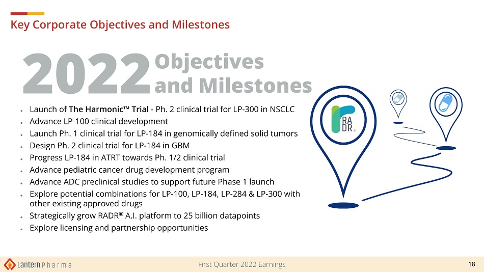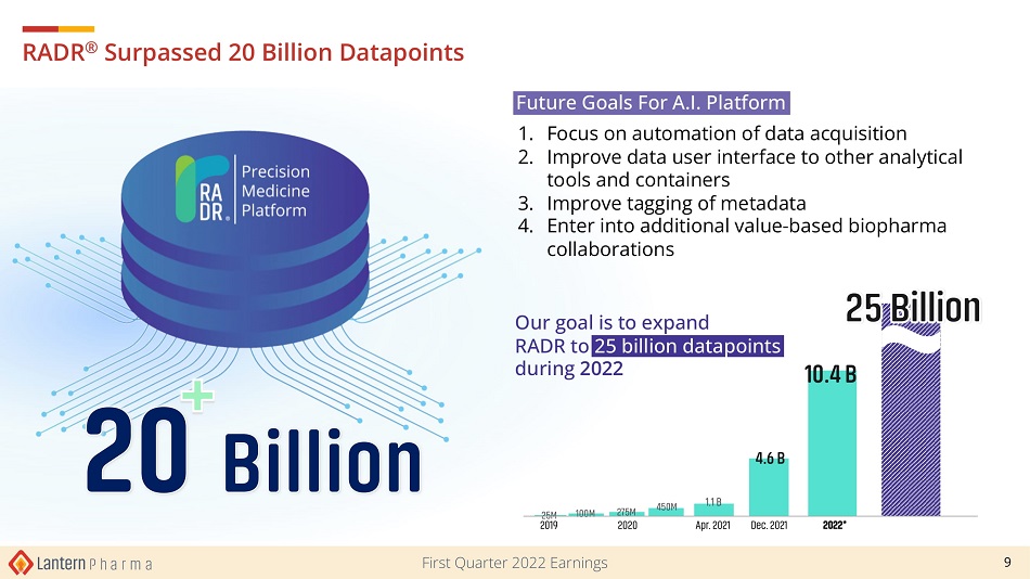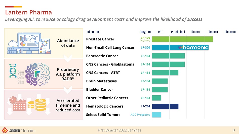 First Quarter 2022 Earnings Lantern Pharma Leveraging A.I. to reduce oncology drug development costs and improve the likelihood of success Abundance of data Proprietary A.I. platform RADR ® Accelerated timeline and reduced cost