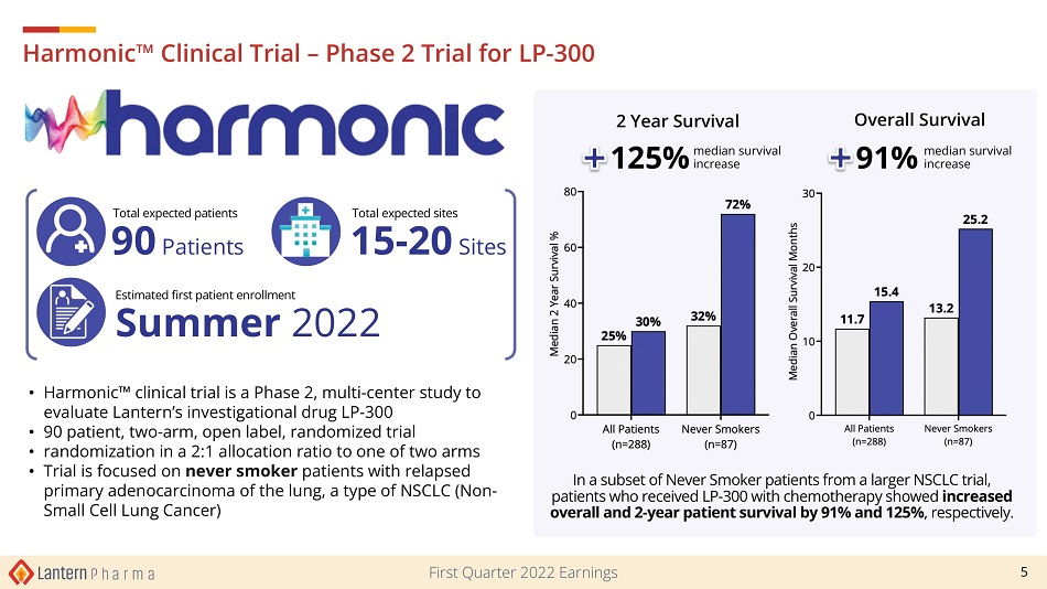 First Quarter 2022 Earnings +DUPRQLF Ƞ &OLQLFDO7ULDO Ȃ 3KDVH 7ULDOIRU/3 5 ‡ +DUPRQLF Ƞ FOLQLFDOWULDOLVD3KDVH PXOWL FHQWHUVWXG\WR HYDOXDWH/DQWHUQ ȇ VLQYHVWLJDWLRQDOGUXJ/3 ‡ SDWLHQWWZR DUPRSHQODEHO UDQGRPL]HGWULDO ‡ UDQGRPL]DWLRQLQD DOORFDWLRQUDWLRWRRQHRIWZRDUPV ‡ 7ULDOLVIRFXVHGRQ QHYHUVPRNHU SDWLHQWVZLWKUHODSVHG SULPDU\DGHQRFDUFLQRPDRIWKHOXQJDW\SHRI16&/&1RQ 6PDOO&HOO/XQJ&DQFHU ΖQDVXEVHWRI1HYHU6PRNHUSDWLHQWVIURPDODUJHU16&/&WULDO SDWLHQWVZKRUHFHLYHG/3 ZLWKFKHPRWKHUDS\VKRZHG LQFUHDVHG RYHUDOODQG \HDUSDWLHQWVXUYLYDOE\ DQG UHVSHFWLYHO\ Total expected patients 90 Patients Total expected sites 15 - 20 Sites (VWLPDWHGILUVWSDWLHQWHQUROOPHQW Summer 2022 <HDU6XUYLYDO 2YHUDOO6XUYLYDO 125% median survival increase median survival increase
