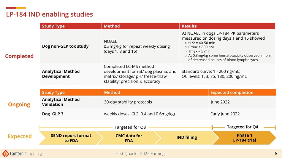 The IND enabling studies for LP-184 are in progress and are anticipated to be completed by Q3 2022. Based on current timeline projections, the Company is targeting to file the LP-184 IND submission with the FDA in Q3 and should be in a position to initiate in-human Phase 1 clinical testing before the end of 2022.