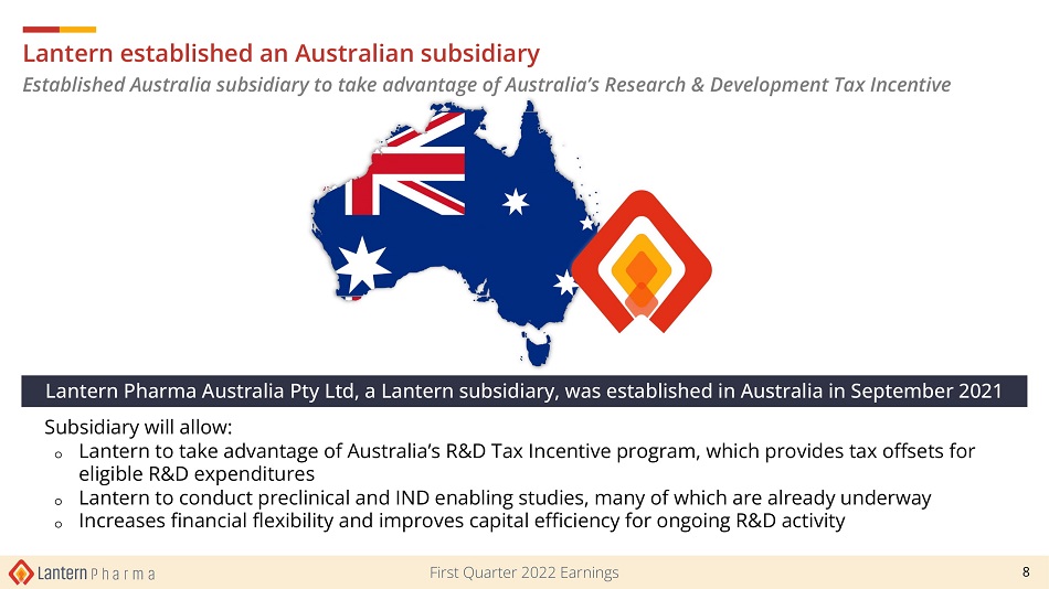 | ● | In September 2021, Lantern created an Australian subsidiary, Lantern Pharma Australia Pty Ltd. The subsidiary was created to enable Lantern to take advantage of Australia’s R&D Tax Incentive program, which provides tax offsets for eligible R&D expenditures. | |