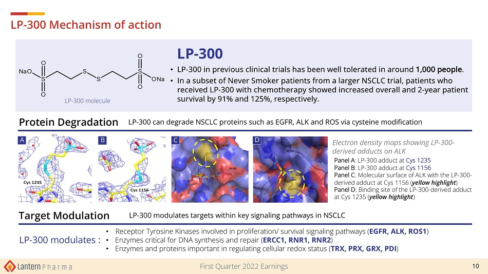 First Quarter 2022 Earnings LP - 300 Mechanism of action 3URWHLQ'HJUDGDWLRQ Panel A : LP - 300 adduct at Cys 1235 Panel B : LP - 300 adduct at Cys 1156 Panel C : Molecular surface of ALK with the LP - 300 - derived adduct at Cys 1156 ( yellow highlight ) Panel D : Binding site of the LP - 300 - derived adduct at Cys 1235 ( yellow highlight ) LP - 300 can degrade NSCLC proteins such as EGFR, ALK and ROS via cysteine modification (OHFWURQGHQVLW\PDSVVKRZLQJ/3 GHULYHG DGGXFWVRQ$/. • LP - 300 in previous clinical trials has been well tolerated in around 1,000 people . • In a subset of Never Smoker patients from a larger NSCLC trial, patients who received LP - 300 with chemotherapy showed increased overall and 2 - year patient survival by 91% and 125%, respectively. A B C ' LP - 300 Target Modulation /3 PRGXODWHVWDUJHWVZLWKLQNH\VLJQDOLQJSDWKZD\VLQ16&/& • Receptor Tyrosine Kinases involved in proliferation/ survival signaling pathways ( EGFR, ALK, ROS 1 ) • Enzymes critical for DNA synthesis and repair ( ERCC 1 , RNR 1 , RNR 2 ) • Enzymes and proteins important in regulating cellular redox status ( TRX, PRX, GRX, PDI ) LP - 300 modulates : LP - 300 molecule 10