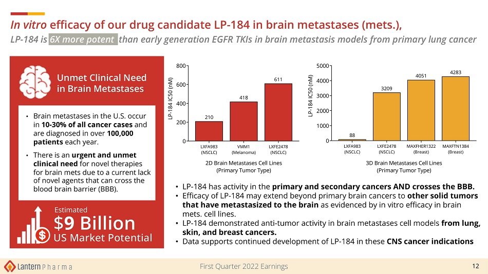 First Quarter 2022 Earnings In vitro efficacy of our drug candidate LP - 184 in brain metastases ( mets .) , • LP - 184 has activity in the primary and secondary cancers AND crosses the BBB. • Efficacy of LP - 184 may extend beyond primary brain cancers to other solid tumors that have metastasized to the brain as evidenced by in vitro efficacy in brain mets . cell lines. • LP - 184 demonstrated anti - tumor activity in brain metastases cell models from lung, skin, and breast cancers. • Data supports continued development of LP - 184 in these CNS cancer indications LP - 184 is 6X more potent than early generation EGFR TKIs in brain metastasis models from primary lung cancer 8QPHW&OLQLFDO1HHG LQ%UDLQ0HWDVWDVHV • Brain metastases in the U.S. occur in 10 - 30% of all cancer cases and are diagnosed in over 100,000 patients each year. • There is an urgent and unmet clinical need for novel therapies for brain mets due to a current lack of novel agents that can cross the blood brain barrier (BBB). $ 9 Billion US Market Potential Estimated