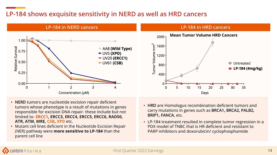 First Quarter 2022 Earnings LP - 184 shows exquisite sensitivity in NERD as well as HRD cancers 13 LP - 184 in HRD cancers LP - 184 in NERD cancers • NERD tumors are nucleotide excision repair deficient tumors whose phenotype is a result of mutations in genes responsible for excision DNA repair - these include but not limited to - ERCC1 , ERCC3, ERCC4, ERCC5, ERCC6, RAD50, ATR, ATM, MRE, CSB , XPD etc. • Mutant cell lines deficient in the Nucleotide Excision Repair (NER) pathway were more sensitive to LP - 184 than the parent cell line ‡ +5' DUH +RPRORJXV UHFRPELQDWLRQGHFLHQWWXPRUVDQG FDUU\PXWDWLRQVLQJHQHVVXFKDV %5&$ %5&$ 3$/% %5,3 )$1&$ HWF ‡ /3 WUHDWPHQWUHVXOWHGLQFRPSOHWHWXPRUUHJUHVVLRQLQD 3';PRGHORI71%&WKDWLV+5GHFLHQWDQGUHVLVWDQWWR 3$53LQKLELWRUVDQGGR[RUXELFLQF\FORSKRVSKDPLGH