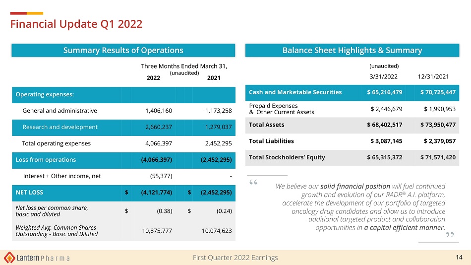 DALLAS, May 3, 2022 /PRNewswire/ -- Lantern Pharma Inc. (NASDAQ: LTRN), a clinical stage biopharmaceutical company using its proprietary RADR® artificial intelligence (“A.I.”) and machine learning (ML) platform to transform the cost, pace, and timeline of oncology drug discovery and development, today announced financial results and operational highlights for the first quarter ended March 31, 2022.