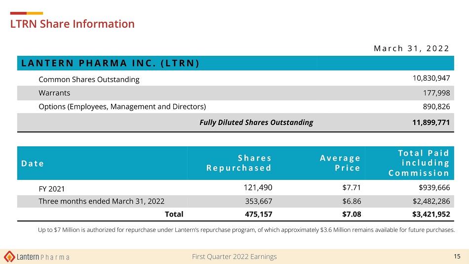 First Quarter 2022 Earnings LTRN Share Information 15 March 31, 2022 LANTERN PHARMA INC. (LTRN) Common Shares Outstanding 10,830,947 Warrants 177,998 Options (Employees, Management and Directors) 890,826 Fully Diluted Shares Outstanding 11,899,771 Date Shares Repurchased Average Price Total Paid including Commission FY 2021 121,490 $7.71 $939,666 Three months ended March 31, 2022 353,667 $6.86 $2,482,286 Total 475,157 $7.08 $3,421,952 Up to $7 Million is authorized for repurchase under Lantern’s repurchase program, of which approximately $3.6 Million remains av ailable for future purchases.