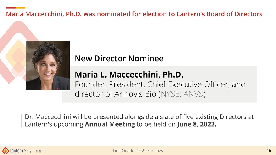 First Quarter 2022 Earnings Maria Maccecchini , Ph.D. was nominated for election to Lantern’s Board of Directors 16 Maria L. Maccecchini , Ph.D. Founder, President, Chief Executive Officer, and director of Annovis Bio ( NYSE: ANVS ) New Director Nominee Dr. Maccecchini will be presented alongside a slate of five existing Directors at Lantern's upcoming Annual Meeting to be held on June 8, 2022.