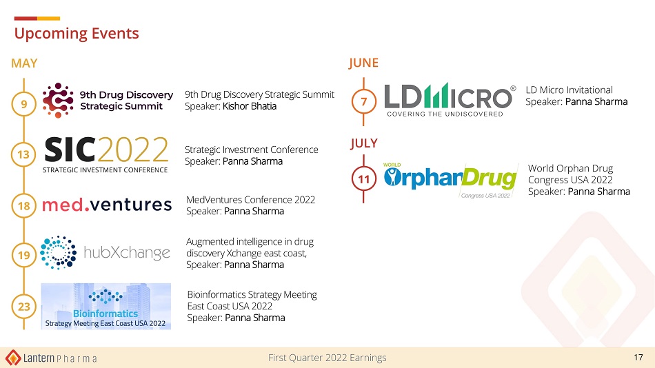 First Quarter 2022 Earnings Upcoming Events 9th Drug Discovery Strategic Summit Speaker: Kishor Bhatia MAY 9 13 Strategic Investment Conference Speaker: Panna Sharma MedVentures Conference 2022 Speaker: Panna Sharma 19 Augmented intelligence in drug discovery Xchange east coast, Speaker: Panna Sharma JUNE 23 Bioinformatics Strategy Meeting East Coast USA 2022 Speaker: Panna Sharma 7 World Orphan Drug Congress USA 2022 Speaker: Panna Sharma LD Micro Invitational Speaker: Panna Sharma JULY 11 18 17