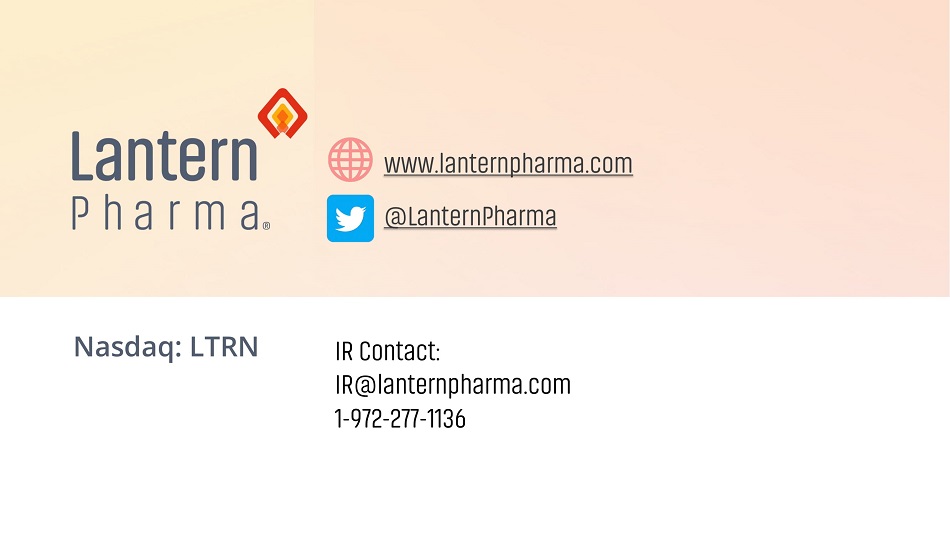 Nasdaq: LTRN IR Contact: IR@lanternpharma.com 1 - 972 - 277 - 1136 www.lanternpharma.com @LanternPharma